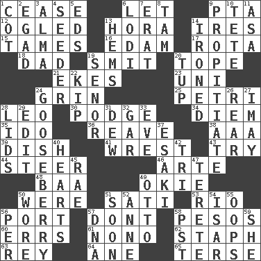 ACROSS 1. Desist 6. Allow 9. Parent Teacher Association (abbr.) 12. Stared 13. Israeli folk dance 14. Angers 15. Corrects by punishment or discipline 16. Dutch treat 17. Roll call or roster of names 18. June honoree 19. Stricken, poetically 20. Drink excessively 21. Supplements with great effort 23. Single; one (prefix) 24. Smile widely 25. _ dish (used to culture cells) 28. Lion 30. Plash 34. South Vietnam president (1954) 35. Wedding promise 36. Rob, plunder, or pillage 38. American Automobile Association (abbr.) 39. Food container 41. Obtain by seizing forcibly or violently 43. Attempt 44. Guide 46. Johnson of "Laugh-In" 48. Sound made by sheep 49. Migrant worker of the '30s 50. We are 51. Suttee (variant) 53. River (Sp.) 56. Sweet dark-red dessert wine 57. Do not 58. Mexican monetary units 60. Blunders 61. Words to Nanette 62. Staphylococcus 63. Marina Del _, California 64. One (Scot) 65. Laconic DOWN 1. Small bed 2. Mild oath 3. _ mater 4. Sowing specialist 5. Begley and Asner 6. Farming town in central California 7. Part of Q.E.F. 8. Scottish cap 9. Conciliate 10. Wig 11. White ___ sheet 13. Cloth borders 14. Pressed 19. Sir (Sp.) 20. Uncastrated adult male sheep 22. Monetary unit of Laos 24. Sour, prickly fruit 26. Stern 27. "If ____ say so..." 28. Hats (slang) 29. Prepare for publication 31. Morning condensation 32. Slender fish 33. First lady 37. 1973 Nobel Price Winner (Physics) Leo 40. Centers of feelings and intuitions 42. Three (prefix) 45. Actress Charlotte 47. Cylindrical with tapered ends 49. Von Bismarck 50. Had on 51. Within a short period 52. Queen of England 1702-14 54. Austrian river, tributary to the Danube 55. I made a mistake 56. For each 57. Heredity factor (abbr.) 58. Pacific Standard Time (abbr.) 59. A female animal or person