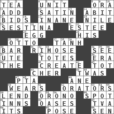 ACROSS 1. Beverage made from leaves 4. A single undivided whole 8. Mouth or opening 11. Say or write further 12. Smooth fabric 14. "This won't hurt ____!" 15. Auction offers 17. Lacking in sense or substance 18. "Death on the ____" 19. French poetic form 21. First name in cosmetics 23. Oval reproductive body of a fowl 24. Part of HMS, perhaps 25. Von Bismarck 27. Hyperbolic tangent 30. Tavern 31. Full of chinks, cracks, or crevices 34. Perceive with the eye 37. Shoshoni 38. Lugs 39. Epoch 40. Definite Article 41. Make 43. Small child 44. "Mermaids" star 45. It was, poetically 47. Parent Teacher Assoc. 49. A saturated hydrocarbon 50. Erodes 52. Speakers 56. Grant temporary use of 57. U. of Maine site 60. Blemish 61. Taverns 62. Fertile tracts in a desert 63. Federal power corp. 64. ___ a Wonderful Life 65. Introduce or present, as a question 66. Elected rep. DOWN 1. Bar bills 2. Singer Brickell 3. Sums up 4. Exploiting 5. Grandmother 6. Call ___ day 7. Shallow baking pan 8. Off-Broadway awards 9. Cause heat under the collar 10. Had dinner 13. Born 14. Against 16. Proofreading order 20. Composer Stravinsky 22. Quiet! 25. Pledge 26. Woody plant 27. Carrier 28. At sea 29. Egg locale 30. With the exception that 32. Hankering 33. Greater amount 34. Stalk of a moss capsule 35. Greek god of love 36. Ingest 42. Inactive volcano in Sicily 44. Automobile 46. Soaks 47. Actor Sean's family 48. Small amounts or degrees 49. Came up 50. Gone 51. "Barney Miller" actor Jack 52. Singles 53. Elects 54. Be footloose 55. Comedian Laurel of Laurel & Hardy 56. Cards in a Roman deck? 58. Reproach for some lapse or misdeed 59. Bear (Spanish)