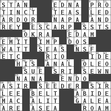 ACROSS 1. Comedian Laurel of Laurel & Hardy 5. Pulitzer Prize-winning author Ferber 9. Adept person 12. A color or tint 14. Afternoon social gatherings 15. Directed 16. Zeal 17. California wine valley 18. Added to 19. Marina Del _, California 20. Fortification 23. Fast planes 24. Gumbo ingredient 25. Dutch treat 27. Give off 30. Naughty child 32. Two (Sp.) 33. Electrical Unit 34. Oceans 36. Overdraft (abbr.) 38. And so on (abbr.) 39. _ de Janeiro 40. Binary compound 43. Part of HMS, perhaps 46. Of or related to the anus 48. Margarine 49. Institute legal proceedings 51. _ Lanka 52. Stitched 53. Grandmother 54. Inside; within (prefix) 56. SW Saudi Arabia district 58. Sowing specialist 61. Title for a knight 64. Area sheltered from the wind 65. Waist strap 66. Remain 68. Big _ 69. Set down 70. An organ shaped like a helmet 71. "We ___ not amused" (Victoria) 72. Toward the sea 73. Wander DOWN 1. Play the lead 2. Hoop that covers a wheel 3. "60 Minutes" Commentator Rooney 4. Non-commissioned officer (abbr.) 5. Inactive volcano in Sicily 6. Letter starter 7. Slept 8. White ___ sheet 9. Suffix with ecto or cyto 10. Monthly bill 11. Probability 13. Long journey 21. Indian titles of respect 22. Device for capturing images 23. Backtalk 24. Baseball player Mel 26. Spanish title 27. She-sheep 28. Floor covering 29. Hankering 31. Aches 35. Flew 37. Do some clerical work 41. Morning condensation 42. A really long time 44. Austrian river, tributary to the Danube 45. Player for Phoenix 47. Actor's bit 48. Bear (Spanish) 50. Artist's stands 53. Sibling's daughter 55. To be drawn or hauled along 56. _ mater 57. Burn superficially 59. Writer Wiesel 60. Singer James 61. Grain storage tower 62. It may be bright or harebrained 63. 480, 500 or 516 sheets of paper 65. Sound made by sheep 67. Oblong piece of solid material