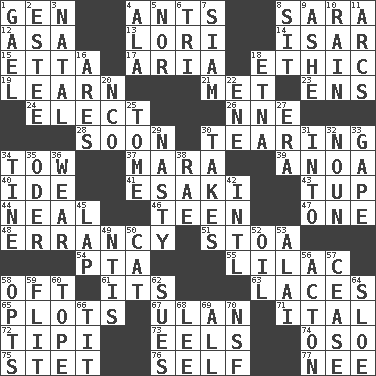 ACROSS 1. Commissioned military rank (abbr.) 4. Pismires 8. "Two Mules for Sister ____" 12. White ___ sheet 13. Australian parrot (variant) 14. Austrian river, tributary to the Danube 15. Singer James 17. Roberta Peters solo 18. Value system 19. Memorize 21. Was introduced to 23. Followers of ems 24. Opt 26. Compass dir. 28. Within a short period 30. Pulling apart 34. Pull behind 37. Hindu Mythology: god of death 39. Small Philippine buffalo 40. Binary compound 41. 1973 Nobel Price Winner (Physics) Leo 43. Uncastrated adult male sheep 44. Be tempered by heat 46. Adolescent 47. Single 48. The state or an instance of erring 51. Portico 54. Parent Teacher Assoc. 55. Pale purple color 58. Often (poetically) 61. It is 63. Shoestrings 65. Schemes 67. ____ Bator, Mongolia 71. Slanted text style (abbr.) 72. Native american tent (variation) 73. Snakelike fish 74. Bear (Spanish) 75. Proofreading order 76. Automatic 77. Born DOWN 1. Highlander 2. First name in cosmetics 3. Brizilian seaport 4. In the manner of 5. And not 6. Three (prefix) 7. Thailand, formerly 8. Be seated 9. American tennis player Robert 10. Precipitation 11. Curves 16. Ancient Greek god of war 18. Inactive volcano in Sicily 20. Non-commissioned officer (abbr.) 22. Compass dir. 25. Heavy book 27. Epoch 29. Characterized by obscenity 30. Receives possession of 31. To the inside or interior of 32. Part of speech 33. Yawn 34. Prong on a fork 35. Baltic tributary 36. Erode 38. Actress Charlotte 42. International (abbr.) 45. Infant locale 49. Nuclear Threat Initiatives 50. Feline 52. Lubricate 53. Jai ____ 56. Gambison 57. Stop 58. Elects 59. Secret move to avoid paying debts 60. Drink excessively 62. Institutes legal proceedings 64. _ gin 66. Teat (slang) 68. Area sheltered from the wind 69. Everything 70. Overdraft (abbr.)