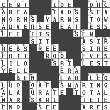 ACROSS 1. Penny 5. Binary compound 8. The grampus (Milton) 11. Type of rug 12. Bits 14. Ocean 15. Typical standards 17. Tall tales 18. Pull behind 19. Contrary to your interests or welfare 21. Ingest 22. Double-curved letter 23. Area sheltered from the wind 24. ___ a Wonderful Life 25. Elected rep. 27. Be seated 28. SW Saudi Arabia district 31. Confederate soldiers (slang) 35. To sift 37. Male parent of an animal 38. Prepare for publication 39. Friend of Pooh 41. Nights before holidays 42. _ and Stitch 43. Indian title of respect (Mr.) 45. For fear that 46. Shout 47. Period 49. Benjamin's nick name 51. Experiment locale 52. Lion 55. Nilotic language 57. Clumsy lout 60. Catching in a trap 62. In the manner of 63. A salt of uric acid 65. Add up to 66. Impair 67. Indian skirt 68. Wig 69. Conclude 70. Observe 71. Ancient Greek god of war DOWN 1. Lessep's creation 2. Eat (away) 3. Impudent aggressiveness 4. Docile 5. Call ___ day 6. Have the gumption 7. Pulitzer Prize-winning author Ferber 8. Clearly or manifestly demonstrative 9. Vintage cars 10. Crow sounds 13. Fast planes 16. Indian titles of respect 17. Next before 20. Commotion 26. Artist's stand 29. Angers 30. State of inaction 31. Trust 32. Singer Brickell 33. Big road sign 34. Took without asking 36. Greek goddess of the dawn 40. Threatening words 44. SW Asia republic 48. Blind as ____ 50. Good sense 52. 61 cubic inches 53. Related on the mother's side 54. Stares 55. Unable to walk 56. ____ Bator 58. Ancient river in northeast Turkey 59. Conductor's collection 61. Roll call or roster of names 64. Neckwear