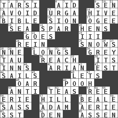 ACROSS 1. Tarsus (plural) 6. Assist 9. Elected rep. 12. Prevent the occurrence of 13. Capital and largest city of Mongolia 14. Hub of activity 15. The Good Book 16. The Jewish people; Israel 17. Double curve, resembling the letter S 18. Ocean 19. Practice fight 20. Coop moms 21. Travels 23. One more than two 24. It's straight from the horse's mouth 25. Frozen precipitation (plural) 28. Compass dir. 30. Yearns 34. Jennifer or Joel 35. The 19th letter of the Greek alphabet 36. Arrive at 38. ___ a Wonderful Life 39. Restaurants 41. Believer in; advocate of (suffix) 43. Eastern Standard Time (abbr.) 44. Travels by water 46. Allows 48. Rowing implement 49. "Silly old bear" 50. Against 51. Afternoon social gatherings 53. To separate or throw off 56. One of the Great Lakes 57. Land elevation 58. Memphis, Tenn. Street 60. Backtalk 61. First man 62. Nest on high 63. Fast jet (abbr.) 64. Lair 65. NE Netherlands city DOWN 1. Bar bill 2. Deliberation 3. Loose flowing garment 4. Fodder prepared in a silo 5. Binary compound 6. Roberta Peters solo 7. Russian composer Stravinsky 8. Daniel's nick name 9. Seigniories (variant) 10. Nights before holidays 11. Born 13. United States Postal Service (abbr.) 14. Weeding 19. Sir (Sp.) 20. Part of HMS, perhaps 22. Lubricate 24. One who advocates reunion 26. Soaks 27. System (abbr.) 28. Nuclear Threat Initiatives 29. Grandmother 31. Teachers' org. 32. Slender fish 33. _-fi 37. Auras 40. Chalkboards 42. Modern: prefix 45. Indian title of respect (Mr.) 47. Triplets 49. Inside of hand 50. Caspian sea tributary 51. Periodic rise and fall of the sea level 52. Style 54. Hearing organs 55. Writer Wiesel 56. Curvy letter 57. Possessed 58. Sound made by sheep 59. Car or cant ending