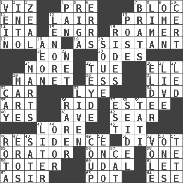 ACROSS 1. Namely 4. Before (prefix) 7. Coalition 11. Compass dir. 12. Den 13. A-one 14. Call ___ day 15. Engineer (abbr.) 16. Nomad 17. Pitcher Ryan 19. Helper 21. Age 23. Lyric poems 24. Greater amount 25. Third day of the wk. 26. Pipe bend 29. French painter Edouard 30. Double-curved letter 31. Falsehood 32. Auto 33. Sodium hydroxide 34. Movie disc 35. Nonscientific branch of learning 36. To free from 37. First name in cosmetics 40. It is so 41. "___ Maria" 42. Dry up 43. Old wives' tales, e.g. 45. Teat (slang) 46. Home 51. A piece of turf (Scot.) 55. Speaker 56. At one time in the past 58. Single 59. Carrier 60. Allodial 61. Allow 62. SW Saudi Arabia district 63. Cooking vessel 64. Compass dir. DOWN 1. Distinctive style or manner 2. To the inside or interior of 3. Ardor 4. Baking dish 5. Capital of Latvia 6. Blunders 7. Naughty children 8. Pale green bean 9. Sign of something about to happen 10. Sure thing 12. Poe poem 13. Airs 16. Amusement-park features 18. A really long time 20. Lush 22. Fish or hair follower 24. Shops 25. Miss Universe 1986, Barbara Palacios _ 26. A person who is older than you are 27. Moving, as bait 28. Directed 29. Female horse 32. Island 33. Make or become more lively 36. Less widely known 37. Eastern Standard Time (abbr.) 38. A glass for beer 39. Jacques of French films 43. 61 cubic inches 44. Scent 46. Round or rotation of duties 47. Greek god of love 48. Suttee (variant) 49. Overturn; upset 50. Inside; within (prefix) 52. Short-tailed, large-bodied rat 53. Washington bills 54. Wig 57. Domesticated feline