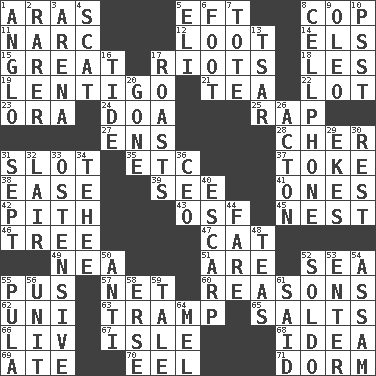 ACROSS 1. Ancient river in northeast Turkey 5. Bank Draft (abbr.) 8. Police officer (slang) 11. Drug cop 12. Spoils 14. Raised railways 15. Relatively large 17. Disturbances 18. French article 19. Small, flat, pigmented spot on the skin 21. Beverage made from leaves 22. Car dealer's back yard 23. Mouth or opening 24. ___ good deed 25. Reproach for some lapse or misdeed 27. Followers of ems 28. "Mermaids" star 31. Narrow, elongated depression 35. And so on (abbr.) 37. Casino tip 38. Relaxation 39. Observe 41. Singles 42. Heart or essence 43. Order of Saint Francis (abbr.) 45. Egg locale 46. Relationship diagram 47. Domesticated feline 49. Teachers' org. 51. "We ___ not amused" (Victoria) 52. Ocean 55. Tenth month of the Hindu calendar 57. Remaining after all deductions 60. Thinks logically 62. Single; one (prefix) 63. _____ steamer (cargo ship) 65. Table seasonings 66. 54 in ancient Rome 67. Small island 68. The content of cognition 69. Had dinner 70. Snakelike fish 71. Dormintory (informal) DOWN 1. White American of non-Hispanic descent 2. Less widely known 3. Sports stadium 4. Go away! 5. Connecticut Ivy Leaguer 6. Pick up the tab 7. Carryall 8. Portable communications device 9. Butter sub 10. Inconspicuous attention getter 13. Russian ruler of old 16. Event that recurs at intervals 17. Exposes to great heat 20. Went 26. NE Massachussets city 29. Supplements with great effort 30. State of inaction 31. Back-to-school mo. 32. Den 33. Clearly or manifestly demonstrative 34. Giggle 36. Corporate head (abbr.) 40. Fortification 44. Conductor's collection 48. Beverages made from leaves 50. Against 52. Twentieth part of a lira 53. Keyboard key 54. Indian state 55. Monetary unit of Botswana 56. A single undivided whole 58. Celtic language 59. Lie 61. Stated 64. Cartoonist voice _ Blanc