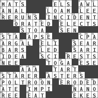 ACROSS 1. Floor protectors 5. Raised railways 8. Leather borer 11. Of or related to the anus 12. Rich soil 13. Area sheltered from the wind 14. Summer TV shows 17. Happening 19. Declaimed 21. Chooses 22. Portico 23. Elected rep. 24. R.R. building 27. Domed church section 29. Accounting whiz (abbr.) 32. Therefore, facetiously 34. Connecticut Ivy Leaguer 36. Shrivel 37. Drinking establishments 38. Directed 39. Indian skirt 40. The content of cognition 41. _-fi 42. Musical pauses 43. Born 44. Ancient Roman robe 46. Compass dir. 47. American Automobile Association (abbr.) 50. Small pie 52. A viewer who gazes fixedly 55. Michaelmas daisies 57. Coward 59. Eaten away 62. Had dinner 63. Body of Kaffir warriors 64. Billionth: prefix 65. To riddle 66. Ingest 67. Supplements with great effort DOWN 1. Spoil 2. A saturated hydrocarbon 3. Pacific island yam 4. Plays smoothly or legato 5. Period of immesurable duration 6. Shoestrings 7. Grin 8. Actor Baldwin 9. Left 10. Allows 12. Flaplike covering 15. Relating to or accompanying birth 16. Discontinue 18. Lair 20. Artist's stands 24. Unit of acoustic absorption 25. Buy and sell 26. Match 28. Voters do this 29. Desist 30. Actors' quests 31. Ascend 33. White ___ sheet 35. Foolish or stupid persons 36. Compass dir. 42. Less widely known 45. Yard entry 47. Nonscientific branch of learning 48. Nest on high 49. Scent 51. Heavy duty weighing machine 52. Coast Guard woman 53. Haul 54. Toward shelter 55. Cuckoo 56. Neighbor of Neb. 58. Elect 60. Compass dir. 61. Two (Sp.)