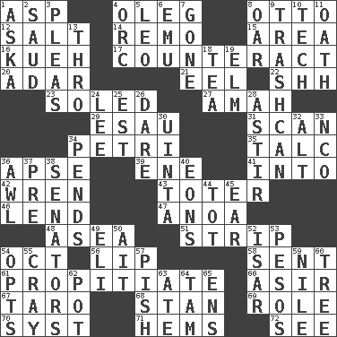 ACROSS 1. Cleo's killer 4. Cassini of fashion 8. Von Bismarck 12. Table seasoning 14. San ____ (Riviera town) 15. Type of rug 16. Malaysian steamed pastry 17. Act in opposition 20. The sixth month of the Jewish calendar 21. Snakelike fish 22. Quiet! 23. Having a sole or soles 27. Nursemaid 29. Son of Isaac 31. Examine minutely or intensely 34. _ dish (used to culture cells) 35. Baby powder 36. Domed church section 39. Compass dir. 41. To the inside or interior of 42. Songbird 43. Carrier 46. Grant temporary use of 47. Small Philippine buffalo 48. At sea 51. Empty completely 54. Sep. follower 56. Mouth edge 58. Transmitted 61. Conciliate 66. SW Saudi Arabia district 67. Pacific island yam 68. Comedian Laurel of Laurel & Hardy 69. Hero or heavy, e.g. 70. System (abbr.) 71. Is hesitant and indecisive 72. Observe DOWN 1. "____ silly question..." 2. Saudi Arabian king (1953-1964) 3. Entreaties 4. The grampus (Milton) 5. Lion 6. Australian flightless bird 7. Went 8. Rowing implement 9. File 13 10. Technology 11. Pledge 13. Through, poetically 18. Beverage made from leaves 19. Shade tree 24. Area sheltered from the wind 25. Eastern Standard Time (abbr.) 26. Have the gumption 28. Being in motion 30. National forest in Provo, Utah 32. Keyboard modifier key 33. Non-commissioned officer (abbr.) 34. Hangs 36. Leather borer 37. Before (prefix) 38. Elected representatives 40. Immeasurably long periods of time 44. Small child 45. Hearing organ 49. Connecticut Ivy Leaguer 50. Small island 52. Austrian river, tributary to the Danube 53. Mexican monetary units 54. Elects 55. Supercomputer manufacturer 57. Expression of disdain 59. The longest river in the world 60. Woody plant 62. Cooking vessel 63. Had dinner 64. Scottish cap 65. Followers of ems