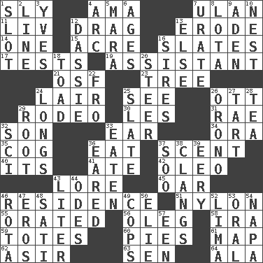 ACROSS 1. Wily 4. Wet nurse (var.) 7. ____ Bator, Mongolia 11. 54 in ancient Rome 12. To draw with force 13. Eat (away) 14. Single 15. 1/640 square mile 16. Chalkboards 17. Trials 19. Helper 21. Order of Saint Francis (abbr.) 23. Family _ (genealogy) 24. Den 25. Observe 26. Baseball player Mel 29. Cowboy competition 30. French article 31. Actress Charlotte 32. Male offspring 33. Hearing organ 34. Mouth or opening 35. Gear tooth 36. Ingest 37. Aroma 40. ___ a Wonderful Life 41. Had dinner 42. Butter sub 43. Old wives' tales, e.g. 45. Rowing implement 46. Dwelling 51. High-strength synthetic material 55. Declaimed 56. Cassini of fashion 58. Retirement account (abbr.) 59. Hauls 60. Sliced desserts 61. Atlas unit 62. SW Saudi Arabia district 63. Elected rep. 64. Wing DOWN 1. Notch 2. Actor's bit 3. Jacques Cousteau's middle name 4. Curve 5. Hindu Mythology: god of death 6. Eons 7. A salt of uric acid 8. Globular water bottle used in Asia 9. An important port of Yemen 10. A home for chicks 12. Hyrax 13. Otherwise 16. Begets 18. Frog relative 20. Bull 22. Back 24. Yearns 25. Schedule 26. U. of Maine site 27. Small pie 28. Afternoon social gathering 29. Carrot, for example 32. _-fi 33. Consumed 36. Having ears or earlike features 37. "Barney Miller" actor Jack 38. Gives out a loud, resonant sound 39. Suggestive of the supernatural 43. 61 cubic inches 44. Lyric poems 46. Round or rotation of duties 47. Greek god of love 48. Suttee (variant) 49. 911 reaches them 50. Writer Wiesel 52. Pale green bean 53. Taken by mouth 54. California wine valley 57. Car or cant ending