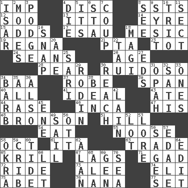 ACROSS 1. Naughty child 4. Compact _ 8. Fast planes 12. "Barney Miller" actor Jack 13. "Tell ____ the Marines!" 14. Jane of fiction 15. Does sums 17. He sold his birthright 18. Mesonic 19. Canadian anthropologist Darnell 21. Parent Teacher Assoc. 23. Small child 24. Actors Connery and Penn 26. Ripen 28. Lightbulb-shaped fruit 30. Boisterous (Brazilian Portuguese) 34. Sound made by sheep 37. Loose flowing garment 39. Connect, as a bridge 40. 100% 41. Standard of perfection 43. Had dinner 44. To erase 46. South American Indian 47. Part of HMS, perhaps 48. "Death Wish" actor 51. Land elevation 54. Erode 55. Trap for birds or small mammals 58. Sep. follower 61. Call ___ day 63. Barter 65. The principal food of baleen whales 67. Fails to keep up a pace 71. Mild oath 72. Travel on or in a vehicle 73. Toward shelter 74. Connecticut Ivy Leaguer 75. Collude with 76. Grandmother 77. Arrange properly for use DOWN 1. Austrian river, tributary to the Danube 2. Methods 3. Porridge 4. Expire 5. It is 6. R.R. building 7. Clever action or accomplishment 8. Perceive with the eye 9. System (abbr.) 10. Musical group of three 11. Religious group 16. Fastener 18. Wise men 20. One (Scot) 22. The 19th letter of the Greek alphabet 25. Indian skirt 27. Begley and Asner 29. "The Thinker" sculptor 30. Arrive at 31. Brightly colored fish 32. Suttee (variant) 33. Washington bills 34. Sharp remark 35. Having or resembling wings 36. In addition 38. Benjamin's nick name 42. (Had) reclined 45. Compass dir. 49. Move on water 50. Baseball player Mel 52. Car dealer's back yard 53. Old wives' tales, e.g. 56. Gurus 57. Peak District village in England 58. Gumbo ingredient 59. Baby bed with high sides 60. Event that recurs at intervals 62. ____ Jay Lerner 64. Prepare for publication 66. Allow 68. Chicken ___ king 69. Commissioned mil. rank 70. Ocean