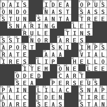 ACROSS 1. Raised platform 5. The main thing one is thinking about 9. Musical composition 13. Southwest Nigerian state 14. Political cartoonist Thomas 15. Backtalk 16. Make senseless or dizzy 17. Before Barbara or Clara 18. Woody plant 19. Catching in a trap 21. Allow 22. General guideline 23. Canisters 24. Fast jet (abbr.) 27. And not 28. Ancient Greek god of war 29. To the left, to Queeg 31. What Jean-Claude Killy likes to do 32. Naughty children 36. Assign a rank or rating to 37. American Automobile Association (abbr.) 38. Small bottle 39. Angers 40. Mouth edge 41. Phone greeting 42. A distinct part 44. Single 46. Area sheltered from the wind 47. Wrote a lyric poem 48. Heavy open wagon 50. Ocean 51. Son of Zeus who helped slay Medusa 54. Ache 56. Pale purple color 58. Fastener 60. Actor Baldwin 61. Genesis locale 62. Become fatigued 63. Have the gumption 64. Oceans 65. Comedian Laurel of Laurel & Hardy DOWN 1. Two (Sp.) 2. Pismires 3. Goddess of spring and wife of Bragi 4. Echolocation 5. More lacking in sense or substance 6. Mild oath, euphamism for damn 7. Eastern Standard Time (abbr.) 8. "One Day ___ Time" 9. Clearly or manifestly demonstrative 10. Pieces 11. Purpose 12. Compass dir. 17. Grain storage tower 20. The smallest animal of a litter 21. Untruth 23. Three (prefix) 24. Indian skirt 25. Coast Guard woman 26. Carry 28. Alias (abbr.) 30. Dwelling 31. Plant excrement 33. Place where flour is made 34. Diluted with white 35. A type of plum 37. Direct toward a target or goal 40. Directed 41. Possessive pronoun 43. Beverage made from leaves 44. Seas 45. Drug cop 47. Flexible twig of a willow tree 49. Trials 51. Entreaty 52. A single undivided whole 53. "Two Mules for Sister ____" 54. Writing tablet 55. Insect wing 56. French article 57. Binary compound 59. Writing instrument