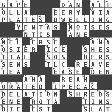 ACROSS 1. Yawn 5. Daniel's nick name 8. Keyboard modifier key 11. Spanish pot 12. Suggestive of the supernatural 13. By way of 14. Food holders 17. Home 19. Gossips 21. Annoying sounds 22. Nuclear Threat Initiatives 23. A saturated hydrocarbon 24. Cartoonist voice _ Blanc 27. Celtic language 29. Santa ___, CA 32. Flexible twig of a willow tree 34. Frozen water 36. "______ My Girl" (Turtles hit) 37. Slanted text style (abbr.) 38. Distress signal 39. Possessive pronoun 40. Elected reps. 41. Affectionate concern, for short 42. Rob, plunder, or pillage 43. Beverage made from leaves 44. Comfort 46. Lair 47. Housemaid (var.) 50. 480, 500 or 516 sheets of paper 52. Spoke pompously 55. Medicinal drug used to evoke vomiting 57. Accusation by an informer 59. Tears up 62. Compass dir. 63. Round or rotation of duties 64. Airtight sealed metal containers 65. Expire 66. Eastern Standard Time (abbr.) 67. Narrow board DOWN 1. Republican Party 2. Everything 3. Live dramatic performance 4. Ingested 5. Morning condensation 6. Sports stadium 7. Thermoplastic polyamide 8. Advice 9. Actor's bit 10. Labels 12. Begley and Asner 15. Keyboard key 16. Use a spoon 18. Whopper 20. Aid 24. Wet 25. First name in cosmetics 26. Woody, climbing, usually tropical plant 28. Learning spot: Fr. 29. Having the leading position 30. Boldness 31. NE Netherlands city 33. Raised railways 35. Fortification 36. A female animal or person 42. Arrive at 45. Observes 47. "One Day ___ Time" 48. Distance measurement (Brit.) 49. Goodbye (Sp.) 51. Shops 52. Wrote a lyric poem 53. Painter Guido (1575-1642) 54. Toward shelter 55. _ tizzy (2 wds.) 56. To provide with a ceiling 58. Baseball player Mel 60. Heredity factor (abbr.) 61. Fast jet (abbr.)