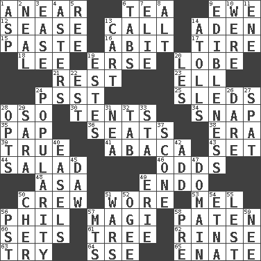 ACROSS 1. Approach 6. Afternoon social gathering 9. She-sheep 12. Gospel singer Marvin 13. Give a ring to 14. Arabian gulf 15. Thick mixture 16. "This won't hurt ____!" 17. Become fatigued 18. Area sheltered from the wind 19. Celtic language 20. Ear part 21. Repose 23. Pipe bend 24. Inconspicuous attention getter 25. Bobsleighs 28. Bear (Spanish) 30. Portable shelters 34. Fastener 35. Infant food 36. Theater features 38. Epoch 39. Loyal 41. Phillipine bananalike plant 43. Put into a specified state 44. Vegetable dish 46. Probability 48. White ___ sheet 49. Inside; within (prefix) 50. Ship's personnel 51. Had on 53. Cartoonist voice _ Blanc 56. Silvers or Donahue 57. Wise men 58. Eucharist need 60. Puts into a specified state 61. Family _ (genealogy) 62. Remove soap 63. Attempt to accomplish something 64. Compass dir. 65. Maternal DOWN 1. Cleo's killer 2. Be tempered by heat 3. Relaxation 4. Michaelmas daisies 5. To sift 6. Bar bills 7. Writer Wiesel 8. The first octave above the treble staff 9. The property of being fit to eat 10. Past tense of be (plural) 11. Compass dir. 13. Heavy open wagon 14. Ringlike coral islands and reefs 19. _____ Park, CO 20. French article 22. Eastern Standard Time (abbr.) 24. Teen's desire 26. Have the gumption 27. Argument over a trivial matter 28. Chooses 29. "Two Mules for Sister ____" 31. Teachers' org. 32. Bar bill 33. R.R. building 37. Biscuitlike quick bread 40. Artist's stands 42. Increase 45. Simpleton 47. Realm 49. One of the Great Lakes 50. "Mermaids" star 51. Armed conflicts 52. Double curve, resembling the letter S 54. Inactive volcano in Sicily 55. For fear that 56. Pacific Standard Time (abbr.) 57. Mountains (abbr.) 58. Before (prefix) 59. Born