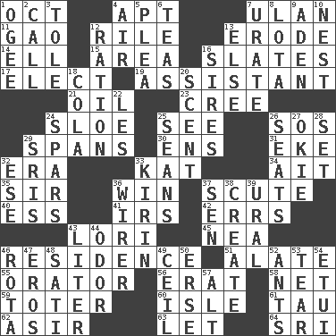 ACROSS 1. Sep. follower 4. Fitting 7. ____ Bator, Mongolia 11. E Mali city 12. Cause heat under the collar 13. Eat (away) 14. Pipe bend 15. Type of rug 16. Chalkboards 17. Choose 19. Aide 21. Petroleum 23. Algonquian 24. _ gin 25. Observe 26. Distress signal 29. Connects, as a bridge 30. Followers of ems 31. Make supply last 32. Period 33. Krazy ___ of comics 34. Small island 35. Title for a knight 36. Acquire through effort 37. Snake scale 40. Curvy letter 41. Big collection agency 42. Blunders 43. Australian parrot (variant) 45. Teachers' org. 46. Home 51. Having winglike extensions 55. Speaker 56. Part of Q.E.F. 58. Remaining after all deductions 59. Carrier 60. Small island 61. The 19th letter of the Greek alphabet 62. SW Saudi Arabia district 63. Allow 64. _ Lanka DOWN 1. Double curve, resembling the letter S 2. Give a ring to 3. Lacquered or enameled metalware 4. Wind 5. Entreaty 6. Beverages made from leaves 7. A salt of uric acid 8. Globular water bottle used in Asia 9. An important port of Yemen 10. A home for chicks 12. Food allowance for one day 13. Otherwise 16. Begets 18. Root beer relative 20. Odor 22. French article 24. Practice fights 25. Seines 26. Theater features 27. Migrant worker of the '30s 28. Arrange properly for use 29. Indian titles of respect 32. Compass dir. 33. Japanese brewing company 36. One who wires 37. Elected rep. 38. Make 39. Mountain range 43. 61 cubic inches 44. Aroma 46. Round or rotation of duties 47. Greek god of love 48. Suttee (variant) 49. To provide with a ceiling 50. Celtic language 52. Pismires 53. Pull into pieces 54. Needle case 57. The first octave above the treble staff