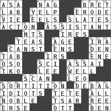ACROSS 1. White ___ sheet 4. Tired old horse 7. Cy Young winner Saberhagen 11. Experiment locale 12. Sharp bark 13. Wear away 14. Compete 15. Snakelike fish 16. Chalkboards 17. 13-14th century defensive garment 19. Helper 21. Mountains (abbr.) 23. Angers 24. Beverages made from leaves 25. Ripen 26. Retirement account (abbr.) 29. 2nd pers. sing. pres. of can (arch.) 30. Followers of ems 31. Lair 32. Keyboard key 33. Big collection agency 34. Compass dir. 35. Bear (Spanish) 36. _-fi 37. Slender Brazilian palm 40. Ring climax 41. Area sheltered from the wind 42. Water source 43. Glance over 45. Lion 46. Drawing lots 51. Debunk (Brit. slang) 55. Foolish or stupid persons 56. False hair 58. Everything 59. Having high moral qualities 60. Russian ruler of old 61. To riddle 62. Celtic language 63. Baseball player Mel 64. Benjamin's nick name DOWN 1. Inventor's middle name 2. Ketch in the Levant 3. Collude with 4. Born 5. Silent film actress Nazimova 6. Global Positioning Systems (abbr.) 7. Naughty children 8. Round or rotation of duties 9. Paradise 10. Trial 12. Gossips 13. Otherwise 16. Fathers 18. Sign of things to come 20. Omens 22. Fast jet (abbr.) 24. Off limits 25. Nest on high 26. Standard of perfection 27. Painter Guido (1575-1642) 28. One (Scot) 29. Keg 32. Small child 33. Ancient Celtic tribe of eastern Britain 36. Narrow boards 37. Leather borer 38. Sowing specialist 39. _ gin 43. Took without asking 44. Quote 46. Trig term 47. Aroma 48. Teases 49. "Beetle Bailey" pooch 50. A home for chicks 52. Sharp remark 53. Toward shelter 54. Small, secluded valley 57. Make lace