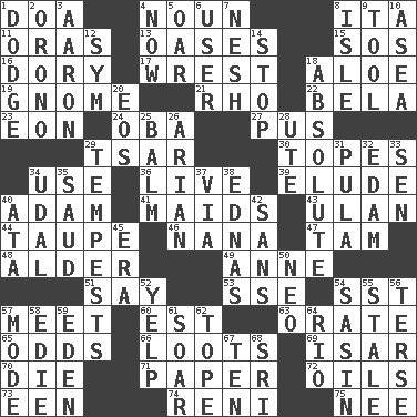 ACROSS 1. ___ good deed 4. Part of speech 8. Call ___ day 11. Mouths or openings 13. Fertile tracts in a desert 15. Distress signal 16. Rowboat 17. Obtain by seizing forcibly or violently 18. _ vera 19. Dwarf 21. 17th letter of the Greek alphabet 22. Actor Lugosi 23. Age 24. Chief or king in Benin or Nigeria 27. Tenth month of the Hindu calendar 29. Russian ruler of old 30. Drinks excessively 34. Purpose 36. Moving, as bait 39. Dodge 40. First of billions? 41. Unmarried girls 43. Uhlan (variant) 44. Grayish beige 46. Nanny 47. Scottish cap 48. Tree or shrub in the Birch family 49. Queen of England 1702-14 51. Declare 53. Compass dir. 54. Fast jet (abbr.) 57. Rendezvous 60. Eastern Standard Time (abbr.) 63. Declaim 65. Likelihood 66. Plunders 69. Austrian river, tributary to the Danube 70. Expire 71. Some stationery 72. Petroleums 73. Car or cant ending 74. Painter Guido (1575-1642) 75. Born DOWN 1. Evade 2. U. of Maine site 3. Composer Copland 4. At this time 5. Boat paddle 6. One who uses or employs something 7. Delicate 8. Small island 9. Instrument 10. At sea 12. Symbol (abbr.) 14. Constrict 18. Utter; complete 20. Greek goddess of the dawn 25. Lip ointment 26. Believer in; advocate of (suffix) 28. Shoshoni 29. Storms 31. Monetary unit of Botswana 32. Dutch treat 33. Elected rep. 34. Allodial 35. Saudi Arabian king (1953-1964) 37. By way of 38. Ferber et al. 40. "One Day ___ Time" 42. Without 45. Epoch 50. Modern: prefix 52. Sharp bark 54. Indian antelope 55. Showing deterioration from age 56. Laconic 57. Method 58. Singer Brickell 59. Locale of original sin 61. Fly high 62. Drink excessively 64. _ de Janeiro 67. Nine, plus one 68. Indian title of respect (Mr.)