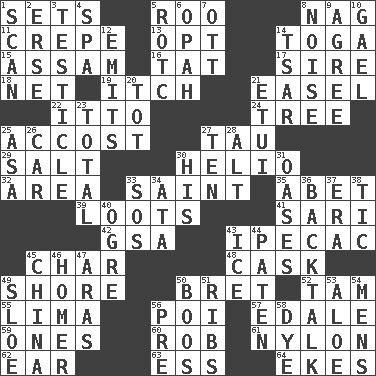 ACROSS 1. Puts into a specified state 5. Friend of Pooh 8. Tired old horse 11. Streamer paper 13. Elect 14. Ancient Roman robe 15. Indian state 16. Make lace 17. Beget 18. Remaining after all deductions 19. Hankering 21. Artist's stand 22. "Tell ____ the Marines!" 24. Family _ (genealogy) 25. Buttonhole 27. The 19th letter of the Greek alphabet 29. Table seasoning 30. Sun: prefix 32. Type of rug 33. Virtuous person 35. Collude with 39. Plunders 41. Indian skirt 42. Girls' org. (abbr.) 43. Medicinal drug used to evoke vomiting 45. Burn to charcoal 48. Keg 49. Dinah or Pauly 50. Cy Young winner Saberhagen 52. Scottish cap 55. Pale green bean 56. Luau course 57. Peak District village in England 59. Singles 60. Director Reiner 61. High-strength synthetic material 62. Ewer handle 63. Curvy letter 64. Supplements with great effort DOWN 1. Glance over 2. Celtic language 3. One of the two male reproductive glands 4. Health resort 5. College mil. group 6. Brightly colored fish 7. Baseball player Mel 8. Annoying sound 9. Match 10. Highlander 12. Sends forth 14. Russian ruler of old 20. Small child 21. Needle holder 23. Add up to 25. White ___ sheet 26. 4-wheeled motor vehicle 27. "___ Little Indians" 28. The first octave above the treble staff 30. Part of HMS, perhaps 31. Fertile tracts in a desert 33. Mayday 34. _ moment's notice (2 wds.) 36. Sass 37. Period 38. Nervous spasm 40. Legendary monster 43. Frozen water 44. Eucharist need 45. Large country 46. Homing pigeon 47. Caspian sea tributary 49. _ gin 50. Scornful sounds 51. Teases 53. _ vera 54. Not women's 56. Before (prefix) 58. Color
