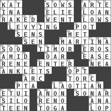 ACROSS 1. Krazy ___ of comics 4. Sty mamas 8. Johnson of "Laugh-In" 12. _ tizzy (2 wds.) 13. Writer Wiesel 14. Grant temporary use of 15. Moved through 18. Left 19. Coldest temperatures 20. Imposing or collecting, as a tax 22. Cooking vessel 23. Elected reps. 24. Was introduced to 25. Elected rep. 26. Chrissie's court nemesis 30. "Barney Miller" actor Jack 33. Southeast Indonesia island 36. Greek god of love 37. Among 39. Rowing implement 40. Comfort 41. French philosopher Descartes 42. Keyboard key 44. Teachers' org. 45. Short socks 47. Choose 50. Curve 51. Torque (variant) 53. Parent Teacher Association (abbr.) 54. Of or relating to Laos or its people 57. Needle case 59. At once, immediately (arch.) 61. Echolocation 63. Grain storage tower 64. Former U.S. Attorney General Janet 65. Santa ___, CA 66. Adolescent 67. Ancient Roman robe 68. Trim (branches) DOWN 1. Apertif with cassis 2. Of or related to the anus 3. Receives possession of 4. Stitched 5. Cassini of fashion 6. Acquire through effort 7. Put into a specified state 8. One to whom something is allotted 9. Carrot, for example 10. The 23rd letter of the Hebrew alphabet 11. Followers of ems 16. Nights before holidays 17. Centimeter-gram-second unit of force 21. Is not 22. For each 24. Impair 26. Greater amount 27. SW Asia republic 28. Characteristic smell of wine 29. Toward the sea 30. "Two Mules for Sister ____" 31. Sign of things to come 32. Pig sound 34. Charged particles 35. Floor covering 38. Conveyance 42. And so on (abbr.) 43. Printing process, for short 46. Period 48. Cooking vessels 49. Musical group of three 52. Lessep's creation 53. Whine 54. Yearn 55. Small Philippine buffalo 56. Billionth: prefix 57. Eastern Standard Time (abbr.) 58. Make a knot 59. Tate display 60. Modern: prefix 62. Strike