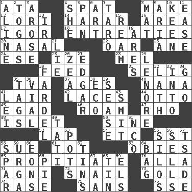 ACROSS 1. "One Day ___ Time" 4. Argument over a trivial matter 8. Cause to be 12. Australian parrot (variant) 14. Ethiopian city, capital of Harari 16. Type of rug 17. Russian composer Stravinsky 18. Pleas 20. Rhinal 22. Boat paddle 23. One (Scot) 24. Compass dir. 25. Ending with capital 28. Cartoonist voice _ Blanc 30. Nourish 31. Major League Baseball Commissioner Bud 35. Federal power corp. 37. Eras 40. Grandmother 41. Den 42. Shoestrings 44. Von Bismarck 45. Mild oath 46. Wander aimlessly 47. 17th letter of the Greek alphabet 48. Small island 50. Trig term 52. Pet locale 54. And so on (abbr.) 55. Fast jet (abbr.) 58. Take to court 61. Small child 63. Off-Broadway awards 65. Appease 70. Silent film actress Nazimova 71. Hindu god of fire 72. Slow-paced one 73. Precious metal 74. To erase 75. Without 76. Compass dir. DOWN 1. Place in a line 2. Ancient Roman robes 3. Came up 4. A female animal or person 5. Baking dish 6. Tate display 7. Edible starchy tuberous root 8. Floor covering 9. Roberta Peters solo 10. Peachy ____! 11. Comfort 13. Lyricist Gershwin 15. 480, 500 or 516 sheets of paper 19. Ancient Greek god of war 21. Untruth 26. Ardor 27. _ Allan Poe 29. Poe poem 30. Burden 32. Thin strip of wood or metal 33. To the inside or interior of 34. E Mali city 35. Labels 36. Small bottle 38. Environmental prefix 39. Gospel singer Marvin 41. Flowery wreath 43. Stricken, poetically 49. Jacques of French films 51. Non-commissioned officer (abbr.) 53. Plant holders 55. Grain storage towers 56. Makes a sale 57. Sadhe (variant) 58. Practice fight 59. Capital and largest city of Mongolia 60. Immeasurably long periods of time 62. Airtight sealed metal containers 64. Container for groceries 66. Sliced dessert 67. American Automobile Association (abbr.) 68. Shallow baking pan 69. Raised railways