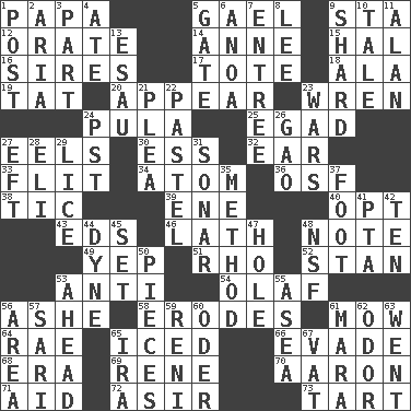 ACROSS 1. Dad 5. Highlander 9. R.R. building 12. Declaim 14. Singer Murray 15. Actor Linden 16. Male parents of animals 17. Lug 18. Chicken ___ king 19. Make lace 20. Seem 23. Songbird 24. Monetary unit of Botswana 25. Mild oath 27. Snakelike fish 30. Curvy letter 32. Hearing organ 33. Sudden quick movement 34. Tiny particle 36. Order of Saint Francis (abbr.) 38. Nervous spasm 39. Compass dir. 40. Elect 43. Begley and Asner 46. Thin strip of wood or metal 48. Observe 49. Slangy assent 51. 17th letter of the Greek alphabet 52. Comedian Laurel of Laurel & Hardy 53. Opposed to 54. Norwegian king 56. American tennis player Robert 58. Eats (away) 61. Cut the grass 64. Actress Charlotte 65. On the rocks 66. Dodge 68. Period 69. French philosopher Descartes 70. Composer Copland 71. Help 72. SW Saudi Arabia district 73. Small pie DOWN 1. Mail 2. Roberta Peters solo 3. Piece 4. Had dinner 5. Yard entry 6. Small Philippine buffalo 7. Main course 8. Area sheltered from the wind 9. Pottery fragment 10. Story 11. Actor Alda or Thicke 13. Son of Isaac 21. Entreaty 22. Soft color 23. Armed conflicts 24. Pacific Standard Time (abbr.) 26. E Mali city 27. Newt 28. Connecticut Ivy Leaguer 29. Louse (plural) 31. Underwater navigation system 35. Mode 37. One third of a yard 41. Parent Teacher Association (abbr.) 42. Nine, plus one 44. Centimeter-gram-second unit of force 45. Put into a specified state 47. Hollow 48. Science/research agcy. 50. Components 53. Having the leading position 55. At sea 56. Length times width 57. Indian skirt 59. Painter Guido (1575-1642) 60. Baltic tributary 61. Hindu Mythology: god of death 62. Scent 63. Gone 65. Lyricist Gershwin 67. Large container