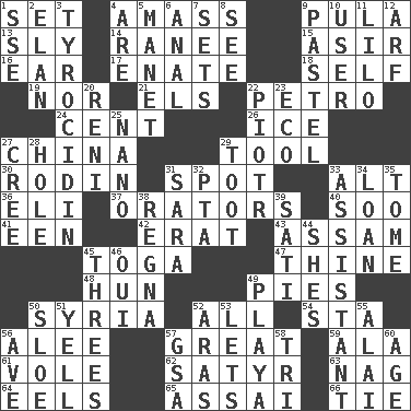 ACROSS 1. Arrange properly for use 4. Collect or gather 9. Monetary unit of Botswana 13. Roguish 14. Indian princess (variant) 15. SW Saudi Arabia district 16. Hearing organ 17. Related on the mother's side 18. Automatic 19. Not either 21. Raised railways 22. Stone: prefix 24. Penny 26. Frozen water 27. Large country 29. Utensil 30. "The Thinker" sculptor 31. Blemish 33. The first octave above the treble staff 36. Connecticut Ivy Leaguer 37. Speakers 40. "Barney Miller" actor Jack 41. Car or cant ending 42. Part of Q.E.F. 43. Indian state 45. Ancient Roman robe 47. One or ones belonging to thee 48. Attila the _ 49. Sliced desserts 50. Damascus' land 52. 100% 54. R.R. building 56. Toward shelter 57. Relatively large 59. In the manner of 61. Grand slam 62. Letch 63. Tired old horse 64. Snakelike fish 65. Slender Brazilian palm 66. Standoff DOWN 1. Compass dir. 2. Enthusiasm 3. Polypeptide antibiotic 4. "We ___ not amused" (Victoria) 5. French painter Edouard 6. Of or related to the anus 7. Puts into a specified state 8. Perceive with the eye 9. Soft color 10. One who uses or employs something 11. _ and Stitch 12. Sandy's bark 20. Painter Guido (1575-1642) 22. Peter (Polish) 23. Environmental prefix 25. Billionth: prefix 27. Algonquian 28. Hollow 29. A blast of a horn 31. "Two Mules for Sister ____" 32. Parent Teacher Assoc. 33. Aide 34. Grant temporary use of 35. Heavy book 38. Rain (Swedish) 39. Suttee (variant) 44. "______ My Girl" (Turtles hit) 45. Trios 46. Fr. "Yes" 49. Beach, in Buenos Aires 50. _ gin 51. Shout 52. Caspian sea tributary 53. Allows 55. Jai ____ 56. "___ Maria" 57. Girls' org. (abbr.) 58. Three (prefix) 60. Ripen