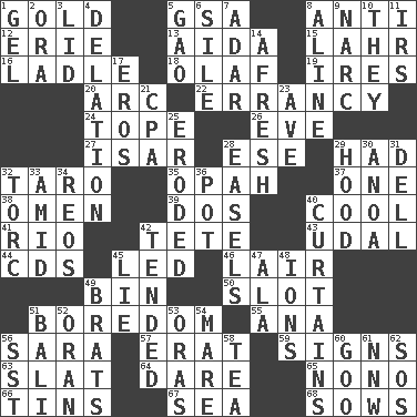 ACROSS 1. Gilded 5. Girls' org. (abbr.) 8. Opposed to 12. One of the Great Lakes 13. Opera by Verdi 15. Cowardly lion portrayer 16. Dipping utensil 18. Norwegian king 19. Angers 20. Curve 22. The state or an instance of erring 24. Drink excessively 26. First lady 27. Austrian river, tributary to the Danube 28. Compass dir. 29. Possessed 32. Pacific island yam 35. Brightly colored fish 37. Single 38. Presage 39. Two (Sp.) 40. Calm and collected 41. River (Sp.) 42. False hair 43. Allodial 44. Music discs 45. Directed 46. Den 49. Storage container 50. Groove 51. Mood resulting from idleness 55. Santa ___, CA 56. "Two Mules for Sister ____" 57. Part of Q.E.F. 59. Public displays of written messages 63. Narrow board 64. Have the gumption 65. Words to Nanette 66. Airtight sealed metal containers 67. Ocean 68. Sty mamas DOWN 1. Set 2. Mouth or opening 3. Hat (slang) 4. Conveyance 5. E Mali city 6. Drop; flow; fall 7. The sixth month of the Jewish calendar 8. Place in a line 9. Drug cop 10. Those people 11. Big collection agency 14. Anew 17. Greek god of love 21. Tax preparer (abbr.) 23. "___ Maria" 25. Worn away 28. Artist's stands 29. Parka part 30. Small Philippine buffalo 31. Small valley 32. Torque (variant) 33. Among 34. Vintage cars 36. Cooking vessel 40. Window treatments 42. Watched over 45. Untruth 47. Wing 48. Charged atoms 49. Naughty children 51. Indonesian resort city 52. NW Algerian seaport 53. Mouths or openings 54. Female horse 56. Fast jet (abbr.) 58. Beverage made from leaves 60. Thick or sticky substance 61. Compass dir. 62. Mayday