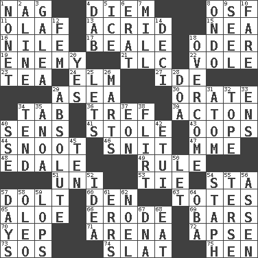 ACROSS 1. Tired old horse 4. South Vietnam president (1954) 8. Order of Saint Francis (abbr.) 11. Norwegian king 13. Sour-tasting 15. Teachers' org. 16. The longest river in the world 17. Calif. Air Force Base 18. Baltic tributary 19. Foe 21. Affectionate concern, for short 22. Grand slam 23. Afternoon social gathering 24. Shade tree 27. Binary compound 29. Toward the sea 30. Speak pompously 34. Keyboard key 36. Unclean, religiously 39. NE Massachussets city 40. Elected reps. 41. Took without asking 43. I made a mistake 44. Snob 46. In a ____ (agitated or irritated) 47. Madame (abbr.) 48. Peak District village in England 49. Governing power 51. Single; one (prefix) 53. Make a knot 54. R.R. building 57. Dunce 60. Lair 63. Hauls 65. _ vera 66. Wear away 69. Long, evenly shaped pieces 70. Slangy assent 71. Sports stadium 72. Domed church section 73. Distress signal 74. Narrow board 75. Layer DOWN 1. Music written for nine 2. Place in a line 3. An organ shaped like a helmet 4. Small moist lump or mass 5. Frozen water 6. Part of Q.E.F. 7. Place where flour is made 8. Southwest Nigerian state 9. Stitch closed the eyes of (a falcon) 10. Conductor's collection 12. Opposite of masc. 14. Tenth: prefix 18. Conquer 20. It is so 25. Allows 26. Shops 28. ___ good deed 29. Utter; complete 31. Tiny particle 32. Drink excessively 33. Followers of ems 34. Look after 35. Small Philippine buffalo 37. Period of immesurable duration 38. Seductive woman who exploits men 40. Compass dir. 42. Needle holder 45. "___ Little Indians" 50. Allow 52. The content of cognition 54. Staphylococcus 55. Laconic 56. NE Netherlands city 57. 24-hour periods 58. Margarine 59. Chops off 61. Blunders 62. Christmas carol 64. Chief or king in Benin or Nigeria 67. Heredity factor (abbr.) 68. Erode