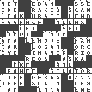 ACROSS 1. Fish or hair follower 4. Dutch treat 8. Compass dir. 11. Mamie's mate 12. Swept the length of 14. Skim 15. Path through which fluid escapes 17. A salt of uric acid 18. Grant temporary use of 19. Center 21. Parts of speech 23. Allow 24. Arrange properly for use 25. Body of Kaffir warriors 27. "Corrida" creature 30. Nursemaid (var.) 31. Poe poem 34. Avid follower 37. Auto 38. Utah city north of Ogden 39. The grampus (Milton) 40. Sight organ 41. More empty; more void 43. _ de Janeiro 44. Vintage cars 45. "____ silly question..." 47. Supplement with great effort 49. To free from 50. Indian princess (variant) 52. Elected representative 56. Hoop that covers a wheel 57. Debunk (Brit. slang) 60. Polynesian shrub of the pepper family 61. Double curve, resembling the letter S 62. Killed 63. French article 64. Small amount or degree 65. South American Indian 66. Compass dir. DOWN 1. The longest river in the world 2. Makes supply last 3. Beverages made from leaves 4. Spew [out] 5. Have the gumption 6. Alias (abbr.) 7. Was introduced to 8. Aroma 9. Without 10. Conclude 13. Lair 14. Change direction abruptly 16. Seaweed 20. Famous astronaut Armstrong 22. Bear (Spanish) 25. "If ____ say so..." 26. Female horse 27. Ancient Roman robes 28. Northwest Algerian city 29. French philosopher Descartes 30. Adept person 32. Writer Wiesel 33. Words to Nanette 34. Tined utensil 35. Roberta Peters solo 36. Non-commissioned officer (abbr.) 42. Water falling in drops from the sky 44. To riddle 46. Neighbor of Neb. 47. Having ears or earlike features 48. Leg joint 49. Canadian anthropologist Darnell 50. Capital of Latvia 51. Begley and Asner 52. Ketch in the Levant 53. Story 54. Baking chamber 55. Raze (variant) 56. Small child 58. Biblical high priest 59. Prohibit