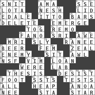 ACROSS 1. In a ____ (agitated or irritated) 5. Nanny (var.) 8. Compass dir. 11. Globular water bottle used in Asia 12. Soft 14. Hat (slang) 15. Peak District village in England 17. "Tell ____ the Marines!" 18. Long, evenly shaped pieces 19. Erase 21. Develop 23. Coat; cloak 25. San ____ (Riviera town) 26. Papal veil 27. _ Lanka 28. Deep reverence 31. Medical imaging device (abbr.) 33. Secret 35. Indian princess (variant) 37. Fermented drink made from hops 38. Opposite of masc. 40. Ardor 41. Foe 43. Be seated 45. Leather borer 46. Science/research agcy. 47. Zeal 50. Grant temporary use of 52. Past tense of be (plural) 53. Experiment locale 54. College paper 56. Cease 61. Pick up the tab 62. Fast planes 65. Trials 66. 100% 67. Pile 68. Small Philippine buffalo 69. Born 70. R.R. building 71. Play the lead DOWN 1. Downhill vehicle 2. Connecting point 3. Slanted text style (abbr.) 4. Lie 5. Black tropical American cuckoo 6. Was introduced to 7. Michaelmas daisies 8. Volcanic refuse 9. Title for a man of rank and authority 10. Begley and Asner 13. Simpsons dad 16. Singer James 18. Sis' sibling 20. Immeasurably long periods of time 22. Independent ruler or chieftain 24. _ course 26. Securely fixed in place 28. Afresh 29. Welt 30. Snakelike fish 31. Not women's 32. Coral collection 34. Affirmative reply 36. Muslim summons to prayer 37. Benjamin's nick name 39. Place where flour is made 42. Jacques Cousteau's middle name 44. Frog relative 48. From or relating to Ireland 49. Makes clutter 51. Collude with 52. Soggy 54. Lacquered or enameled metalware 55. Opening into or through something 57. Oceans 58. Is not 59. Portico 60. Russian ruler of old 61. Air blower 63. Make lace 64. Health resort