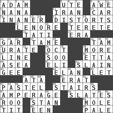 ACROSS 1. First of billions? 5. Shoshoni 8. Deep reverence 11. Nanny 12. SW Asia republic 13. 4-wheeled motor vehicle 14. Sillier 17. What propaganda does 19. Poe poem 21. Cigar-shaped 22. Jacques of French films 23. Period 24. Slender fish 27. Docile 29. Scottish cap 32. A salt of uric acid 34. Sep. follower 36. Greater amount 37. Actor's bit 38. "Barney Miller" actor Jack 39. Singer James 40. At sea 41. Biblical high priest 42. Killed 43. Turn to the right 44. Flair 46. Allow 47. "One Day ___ Time" 50. Part of Q.E.F. 52. Soft color 55. Flight of steps 57. Electrical Measurement 59. Chalkboards 62. Friend of Pooh 63. Comedian Laurel of Laurel & Hardy 64. Undercover agent 65. Teat (slang) 66. Car or cant ending 67. Light colored DOWN 1. Cuckoo 2. One of the 12 tribes of Israel 3. Of or related to the anus 4. French painter Edouard 5. RI univ. 6. Clothes sense 7. Keyboard key 8. Measure of real estate 9. Electrical Unit 10. Celtic language 12. Binary compound 15. Maternal 16. Roll call or roster of names 18. Mouth or opening 20. Full of chinks, cracks, or crevices 24. POW camp 25. Get up 26. Indian princess (variant) 28. Learning spot: Fr. 29. "_____ Recall" 30. Nick name for Arthur 31. Intended 33. Beverage made from leaves 35. Rest room 36. Cartoonist voice _ Blanc 42. Slow-paced one 45. Caspian sea tributary 47. Had dinner 48. Laconic 49. Having winglike extensions 51. _____ steamer (cargo ship) 52. Piece 53. Mine, in Marseilles 54. Blemish 55. Elected rep. 56. Portico 58. Separate the seeds from cotton 60. Pipe bend 61. Observe