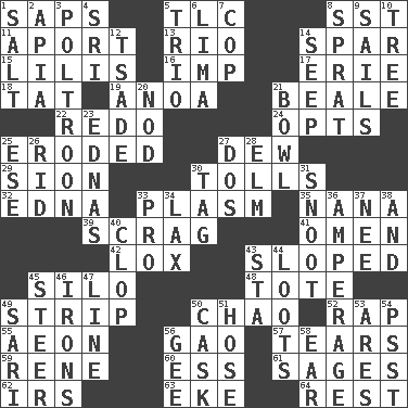 ACROSS 1. Plant excrements 5. Affectionate concern, for short 8. Fast jet (abbr.) 11. To the left, to Queeg 13. _ de Janeiro 14. Practice fight 15. Ms. Damita and namesakes 16. Mischievous child 17. One of the Great Lakes 18. Make lace 19. Small Philippine buffalo 21. Calif. Air Force Base 22. Redecorate 24. Elects 25. Worn away 27. Morning condensation 29. The Jewish people; Israel 30. For Whom the Bell _____ 32. Pulitzer Prize-winning author Ferber 33. Suffix with ecto or cyto 35. Grandmother 39. Strangle with an iron collar 41. Presage 42. Brine-cured salmon 43. Had an oblique or slanted direction 45. Grain storage tower 48. Carryall 49. Empty completely 50. US Secretary of Labor Elaine L. _ 52. Reproach for some lapse or misdeed 55. Age 56. E Mali city 57. Pulls into pieces 59. French philosopher Descartes 60. Double-curved letter 61. Gurus 62. Big collection agency 63. Supplement with great effort 64. Respite DOWN 1. Table seasoning 2. Capital of Western Samoa 3. Coward 4. _ Lanka 5. Musical group of three 6. Pale green bean 7. Police officer (slang) 8. Small fatty European fish 9. Travels by water 10. Woody plant 12. Sadhe (variant) 14. Ooze 20. Lower and raise head in agreement 21. Soup holder 23. Ferber et al. 25. Compass dir. 26. To free from 27. Two (Sp.) 28. Shade tree 30. Label 31. Snout, nose 33. Adept person 34. Not strict 36. Electrical Measurement 37. Born 38. Added to 40. Hoof sound 43. R.R. building 44. Plunders 45. Bull 46. Metal shackles 47. Actor's bit 49. Indian skirt 50. Keg 51. Flexible conduit 53. Ancient Greek god of war 54. Inconspicuous attention getter 56. Turn to the right 58. Hearing organ