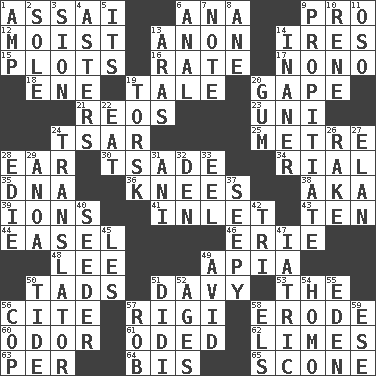ACROSS 1. Slender Brazilian palm 6. Santa ___, CA 9. Adept person 12. Damp 13. Soon (poet.) 14. Angers 15. Secret plans 16. Assign a rank or rating to 17. Words to Nanette 18. Compass dir. 19. Falsehood 20. Stare wonderingly 21. Vintage cars 23. Single; one (prefix) 24. Russian ruler of old 25. Distance measurement (Brit.) 28. Hearing organ 30. Sadhe (variant) 34. Monetary unit of Yemen 35. Heredity factor (abbr.) 36. Leg joints 38. Alias (abbr.) 39. Charged particles 41. An arm off of a larger body of water 43. Nine, plus one 44. Artist's stand 46. One of the Great Lakes 48. Area sheltered from the wind 49. Capital of Western Samoa 50. Small boys 51. American folk hero Crockett 53. Definite Article 56. Quote 57. Swiss mountan, "Queen of the Mountains" 58. Wear away 60. Aroma 61. Wrote a lyric poem 62. Citrus fruits 63. For each 64. Altar cloth linen 65. Biscuitlike quick bread DOWN 1. Electrical Unit 2. Not divided or shared with others 3. The Jewish people; Israel 4. Michaelmas daisies 5. ___ a Wonderful Life 6. Of or related to the anus 7. Make mention of 8. One (Scot) 9. Appease 10. French philosopher Descartes 11. Bear (Spanish) 13. Ancient river in northeast Turkey 14. More lacking in sense or substance 19. Cod relative 20. Chewing product 22. Consume 24. Interpreter 26. Immoral or dissolute person 27. Liveliness 28. Singer Brickell 29. Small Philippine buffalo 31. Cuckoo 32. Lair 33. Snakelike fish 37. Oozy 40. Sowing specialist 42. Three (prefix) 45. French article 47. Of or pertaining to medicine 49. Enthusiastic 50. Periodic rise and fall of the sea level 51. "You Light Up My Life" star Conn 52. Matures 54. Like (prefix) 55. Paradise 56. Police officer (slang) 57. Director Reiner 58. Raised railways 59. Compass dir.