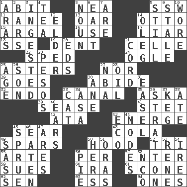 ACROSS 1. "This won't hurt ____!" 5. Teachers' org. 8. Compass dir. 11. The wife of a rajah (variant) 13. Rowing implement 14. Von Bismarck 15. Therefore, facetiously 16. Purpose 17. One who doesn't tell the truth 18. Compass dir. 19. Gouge 21. Cell (Danish) 22. Broke a traffic law 24. Stare at amorously 25. Michaelmas daisies 27. Not either 29. Travels 30. Remain 32. Inside; within (prefix) 33. Lessep's creation 35. "____ silly question..." 39. Gospel singer Marvin 41. Proofreading order 42. "One Day ___ Time" 43. Develop 45. Shrivel 48. Root beer relative 49. Practice fights 50. Parka part 52. Three (prefix) 55. Johnson of "Laugh-In" 56. For each 57. Keyboard key 59. Institutes legal proceedings 60. Retirement account (abbr.) 61. Biscuitlike quick bread 62. Elected rep. 63. Curvy letter 64. Washington bills DOWN 1. Ancient river in northeast Turkey 2. Long, evenly shaped pieces 3. Consumed 4. Afternoon social gathering 5. Part of speech 6. 90 degrees 7. "We ___ not amused" (Victoria) 8. Free from disturbance or agitation 9. Lacking originality or spontaneity 10. Had on 12. A person who is older than you are 14. Cassini of fashion 20. Begley and Asner 21. Drawstring 23. Mexican monetary units 25. Mature 26. Manchild 27. Basketball assoc. 28. Petroleum 30. One (Scot) 31. Artist's stand 33. Domesticated feline 34. White ___ sheet 36. Ski resort town in Vermont 37. Cask 38. Had dinner 40. Hearing organs 43. Environmental prefix 44. Methods 45. Upset 46. Consumed 47. Ancient Greek god of war 49. Backtalk 50. Possessive pronoun 51. Mouths or openings 53. French philosopher Descartes 54. Angers 56. Sliced dessert 58. Non-commissioned officer (abbr.)