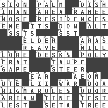 ACROSS 1. The Jewish people; Israel 5. Inside of hand 9. Food container 13. SW Asia republic 14. Type of rug 15. Indian princess (variant) 16. Sense of smell 17. Homes 19. Compass dir. 20. ___ a Wonderful Life 21. Spanish title 22. The first octave above the treble staff 23. Fast planes 25. Fast jet (abbr.) 26. A person who is older than you are 30. Ancient river in northeast Turkey 34. Break or tear apart 35. Place where flour is made 36. Old wives' tales, e.g. 39. Writing tables 42. Much (prefix) 43. Part of Q.E.F. 44. Grayish beige 46. Stare wonderingly 47. Bull 48. Ewer handle 51. Age 54. Shoshoni 57. Cards in a Roman deck? 58. Armed conflict 60. ___ good deed 62. Frustrating wastes of time 65. Scent 66. Believer in; advocate of (suffix) 67. Prong on a fork 68. Trial 69. For fear that 70. Bristle 71. Relationship diagram DOWN 1. Trig term 2. Removes the wrinkles 3. Fertile tracts in a desert 4. Compass dir. 5. Piece 6. Ancient Greek god of war 7. French article 8. Unmarried girls 9. Daniel's nick name 10. South American Indian 11. Stitch closed the eyes of (a falcon) 12. Command 15. Monthly bill 18. Two (Sp.) 20. Capri or Wight 24. Cylindrical with tapered ends 27. Male parent 28. First lady 29. Musical pauses 30. Electrical Unit 31. River (Sp.) 32. 100% 33. Cunning 36. Part of a journey 37. Mouth or opening 38. Reproach for some lapse or misdeed 40. Krazy ___ of comics 41. Take to court 45. Lightbulb-shaped fruit 48. Enthusiasm 49. Atmosphere 50. Debaucheries 52. More peculiar 53. Trap for birds or small mammals 54. Mountain range 55. Become fatigued 56. Armor plate that protects the chest 58. Left 59. Toward the sea 61. Johnson of "Laugh-In" 63. Floor protector 64. Falsehood 65. Baseball player Mel