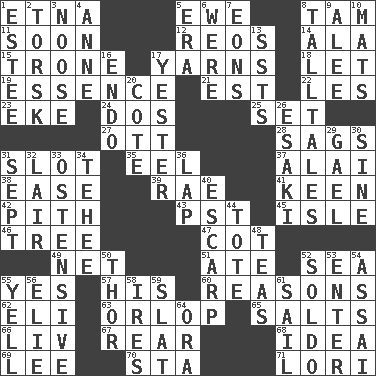 ACROSS 1. Inactive volcano in Sicily 5. She-sheep 8. Scottish cap 11. Within a short period 12. Vintage cars 14. Wing 15. Heavy duty weighing machine 17. Entertaining tales 18. Allow 19. Substance 21. Eastern Standard Time (abbr.) 22. French article 23. Supplement with great effort 24. Two (Sp.) 25. Arrange properly for use 27. Baseball player Mel 28. Sinks 31. Narrow, elongated depression 35. Snakelike fish 37. Jai ____ 38. Relaxation 39. Actress Charlotte 41. Peachy ____! 42. Heart or essence 43. Pacific Standard Time (abbr.) 45. Small island 46. Relationship diagram 47. Small bed 49. Fish or hair follower 51. Had dinner 52. Ocean 55. Affirmative reply 57. Part of HMS, perhaps 60. Thinks logically 62. Connecticut Ivy Leaguer 63. Lowest deck of a ship 65. Table seasonings 66. 54 in ancient Rome 67. Rump 68. The main thing one is thinking about 69. Area sheltered from the wind 70. R.R. building 71. Australian parrot (variant) DOWN 1. First name in cosmetics 2. Cod relative 3. Trap for birds or small mammals 4. Singer Murray 5. Period 6. We are 7. Immeasurably long periods of time 8. Baron Munchausen's specialties 9. Toward shelter 10. Floor coverings 13. Fast planes 16. Inside; within (prefix) 17. Next before 20. ____ d'Azur (French Riviera) 26. 1973 Nobel Price Winner (Physics) Leo 29. Highlander 30. Trig term 31. Back-to-school mo. 32. Den 33. Clearly or manifestly demonstrative 34. Giggle 36. Pet locale 40. Fortification 44. Haul 48. Afternoon social gatherings 50. Son of Odin 52. Twentieth part of a lira 53. Keyboard key 54. Slender Brazilian palm 55. Shout 56. Writer Wiesel 58. Angers 59. Narrow board 61. Travel by water 64. Mouth or opening