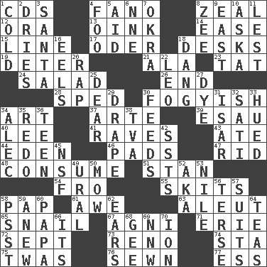 ACROSS 1. Music discs 4. Papal veil 8. Ardor 12. Mouth or opening 13. Pig sound 14. Comfort 15. Actor's bit 17. Baltic tributary 18. Writing tables 19. Prevent from occurring 21. In the manner of 23. Make lace 24. Vegetable dish 26. Conclude 28. Broke a traffic law 30. Out of fashion; old fashioned 34. Tate display 37. Johnson of "Laugh-In" 39. Son of Isaac 40. Area sheltered from the wind 41. All-night dance parties 43. Had dinner 44. Paradise 46. Groovy apts. 47. To free from 48. Ingest 51. Comedian Laurel of Laurel & Hardy 54. Away 55. Burlesque acts 58. Infant food 61. Deep reverence 63. Eskimo relative 65. Slow-paced one 67. Hindu god of fire 71. One of the Great Lakes 72. Back-to-school mo. 73. Western Nevada city 74. R.R. building 75. It was, poetically 76. Stitched 77. Double-curved letter DOWN 1. Lacking warmth 2. Frees from moisture 3. Before Barbara or Clara 4. Egg _ yung 5. Assist 6. Compass dir. 7. Gumbo ingredient 8. Last letter of the English alphabet 9. 90 degrees 10. "____ silly question..." 11. For fear that 16. Snakelike fish 18. Mild oath, euphamism for damn 20. Strike 22. Lion 25. Letter starter 27. Color 29. Window treatment 30. Eats 31. Austrian river, tributary to the Danube 32. Suttee (variant) 33. Became colored 34. Actor Baldwin 35. Do over again 36. Adolescent 38. Federal power corp. 42. Fast planes 45. Overdraft (abbr.) 49. Mountain range 50. Cut the grass 52. Alias (abbr.) 53. Mediterranean tributary 56. Laconic 57. Costumes for special activities 58. Inconspicuous attention getter 59. Afresh 60. Dad 62. Hearing organs 64. Beverages made from leaves 66. It is 68. Unit of force equal to gravity 69. Compass dir. 70. Electrically charged atom