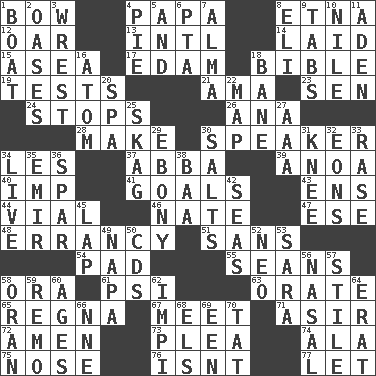 ACROSS 1. Arrow shooter 4. Dad 8. Inactive volcano in Sicily 12. Rowing implement 13. International (abbr.) 14. Put down 15. At sea 17. Dutch treat 18. The Good Book 19. Trials 21. Housemaid (var.) 23. Elected rep. 24. Discontinues 26. Santa ___, CA 28. Create 30. Orator 34. French article 37. Swedish rock group 39. Small Philippine buffalo 40. Mischievous child 41. Finish lines 43. Followers of ems 44. Small bottle 46. Nathan's nickname 47. Compass dir. 48. The state or an instance of erring 51. Without 54. Writing tablet 55. Seines 58. Mouth or opening 61. 23rd letter of the Greek alphabet 63. Declaim 65. Rain (Swedish) 67. Confront 71. SW Saudi Arabia district 72. So be it 73. Entreaty 74. Insect wing 75. Characteristic smell of wine 76. Is not 77. Allow DOWN 1. Water vessel 2. Fertile tracts in a desert 3. Obtain by seizing forcibly or violently 4. Sliced dessert 5. Plus 6. Parent Teacher Assoc. 7. _ mater 8. Connecticut Ivy Leaguer 9. Bar bills 10. The longest river in the world 11. An important port of Yemen 16. Smallest unit of an element 18. Object of repulsion 20. Health resort 22. Atlas unit 25. Heroin 27. Auto club (abbr.) 29. Black 30. Table seasonings 31. Leg joint 32. Immeasurably long periods of time 33. Raze (variant) 34. Not recorded 35. Arab leader 36. Coast Guard woman 38. Sound made by sheep 42. Oceans 45. Infant locale 49. California wine valley 50. Music discs 52. Modern: prefix 53. "Two Mules for Sister ____" 56. Rhinal 57. Vertical member of a panel or frame 58. Northwest Algerian city 59. San ____ (Riviera town) 60. Eons 62. Body of Kaffir warriors 64. Part of Q.E.F. 66. Compass dir. 68. Raised railways 69. Car or cant ending 70. Make lace
