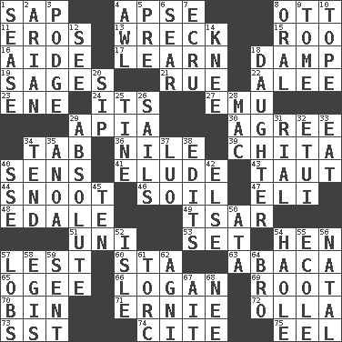 ACROSS 1. Plant excrement 4. Domed church section 8. Baseball player Mel 11. Greek god of love 13. Raze 15. Friend of Pooh 16. Helper 17. Memorize 18. Moist 19. Gurus 21. Sorrow 22. Toward shelter 23. Compass dir. 24. ___ a Wonderful Life 27. Australian flightless bird 29. Capital of Western Samoa 30. Match 34. Keyboard key 36. "Death on the ____" 39. Riviera of "Kiss of the Spider Woman" 40. Elected reps. 41. Dodge 43. Tense 44. Snob 46. The visible part of the earth's surface 47. Connecticut Ivy Leaguer 48. Peak District village in England 49. Russian ruler of old 51. University (slang) 53. Put into a specified state 54. Layer 57. For fear that 60. R.R. building 63. Phillipine bananalike plant 65. Double curve, resembling the letter S 66. Utah city north of Ogden 69. Carrot, for example 70. Storage container 71. Bert's buddy 72. Rounded earthenware pot or jar 73. Fast jet (abbr.) 74. Quote 75. Snakelike fish DOWN 1. Gospel singer Marvin 2. Believer in; advocate of (suffix) 3. Porridge 4. Leather borer 5. Before (prefix) 6. Wither 7. Shade of tan 8. Of the mouth 9. Heavy book 10. Drink excessively 12. Observe 14. Leg joint 18. Female offspring 20. Small drink 25. Prong on a fork 26. Moves on water 28. Apple computer (short form) 29. Utter; complete 31. Monetary unit of Yemen 32. Needle holder 33. Consume 34. Watch over 35. Small Philippine buffalo 37. Nilotic language 38. Proofreads 40. Compass dir. 42. Otherwise 45. "___ Little Indians" 50. "One Day ___ Time" 52. Capri or Wight 54. White Person, in Hawaii 55. Learning spot: Fr. 56. Brizilian seaport 57. Tennis shots 58. Armor plate that protects the chest 59. Transmitted 61. Torque (variant) 62. Hindu god of fire 64. Sis' sibling 67. Small island 68. Born