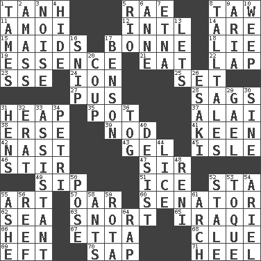 ACROSS 1. Hyperbolic tangent 5. Actress Charlotte 8. The 23rd letter of the Hebrew alphabet 11. Mine, in Marseilles 12. International (abbr.) 14. "We ___ not amused" (Victoria) 15. Women servants 17. Child's nurse 18. Whopper 19. Center 21. Erode 22. Infant locale 23. Compass dir. 24. Electrically charged atom 25. Put into a specified state 27. Tenth month of the Hindu calendar 28. Sinks 31. Pile 35. Cooking vessel 37. Jai ____ 38. Celtic language 39. Lower and raise head in agreement 41. Peachy ____! 42. Political cartoonist Thomas 43. Set 45. Small island 46. Tumult 47. Title for a knight 49. Small drink 51. Frozen water 52. R.R. building 55. Nonscientific branch of learning 57. Rowing implement 60. Elected representative 62. Ocean 63. Derisive sound 65. Resident of Iraq 66. Layer 67. Singer James 68. A slight indication 69. Bank Draft (abbr.) 70. Plant excrement 71. The bottom of a shoe or boot DOWN 1. Domesticates 2. Collect or gather 3. Annoying sound 4. Flintstone garb 5. River (Sp.) 6. Queen of England 1702-14 7. Inactive volcano in Sicily 8. Baron Munchausen's specialties 9. Roberta Peters solo 10. Shed a tear 13. Allows 16. Clip 17. Gillaume's butler role 20. Overturn; upset 26. 1973 Nobel Price Winner (Physics) Leo 29. Highlander 30. Trig term 31. Coop moms 32. Part of Q.E.F. 33. Aide 34. _ dish (used to culture cells) 36. Coat; cloak 40. Cease 44. Louse (plural) 48. Painter Guido (1575-1642) 50. Airs 52. Showing deterioration from age 53. Woman's close-fitting hat 54. Satellite of Uranus 55. American tennis player Robert 56. Coral ridge 58. Pismires 59. Round or rotation of duties 61. Bowlike part 64. Strike