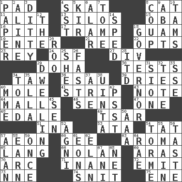 ACROSS 1. Writing tablet 4. Three-handed card game 8. Domesticated feline 11. Set down 13. Grain storage towers 15. Chief or king in Benin or Nigeria 16. Essential or central part 17. _____ steamer (cargo ship) 18. Island territory of the United States 19. Keyboard key 21. Portuguese money of account (variant) 22. Elects 23. Marina Del _, California 24. Order of Saint Francis (abbr.) 27. HTML Container Element 29. Capital of the state of Qatar 30. Trials 34. The 23rd letter of the Hebrew alphabet 36. He sold his birthright 39. Frees from moisture 40. Undercover agent 41. Long narrow piece of something 43. Make mention of 44. Promenades 46. Elected reps. 47. Single 48. Peak District village in England 49. Russian ruler of old 51. _ tizzy (2 wds.) 53. "One Day ___ Time" 54. Make lace 57. Age 60. Turn to the right 63. Scent 65. Long (Scottish) 66. Pitcher Ryan 69. Caspian sea tributary 70. Curve 71. Silly 72. Give off 73. Compass dir. 74. In a ____ (agitated or irritated) 75. Compass dir. DOWN 1. Some stationery 2. Place in a line 3. Short, simple song 4. Fast jet (abbr.) 5. Apertif with cassis 6. Having or resembling wings 7. Heavy book 8. Clever action or accomplishment 9. Blind as ____ 10. Scottish caps 12. Definite Article 14. Moved rapidly 18. State head 20. Friend of Pooh 25. "______ My Girl" (Turtles hit) 26. Goes without food and/or water 28. It would 29. Residence 31. The Jewish people; Israel 32. False hair 33. Compass dir. 34. Frog relative 35. Silent film actress Nazimova 37. "We ___ not amused" (Victoria) 38. National forest in Provo, Utah 40. Madame (abbr.) 42. Inconspicuous attention getter 45. Elected rep. 50. American Automobile Association (abbr.) 52. Hindu god of fire 54. Singer Mel 55. With great haste 56. Clothes sense 57. ____ Jay Lerner 58. Merit 59. At one time in the past 61. Immeasurably long periods of time 62. Enthusiasm 64. Actress Charlotte 67. Black tropical American cuckoo 68. Fish or hair follower