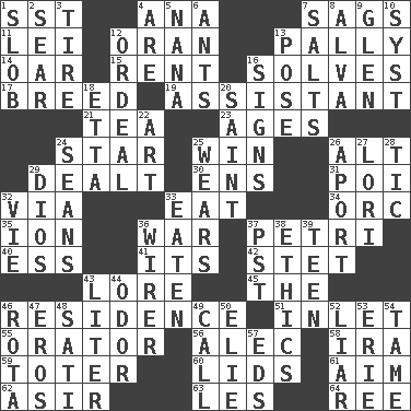 ACROSS 1. Fast jet (abbr.) 4. Santa ___, CA 7. Settles 11. Luau accessory 12. NW Algerian seaport 13. Friendly 14. Rowing implement 15. Monthly bill 16. Finds the solution 17. A special lineage 19. Helper 21. Beverage made from leaves 23. Ripens 24. Play the lead 25. Victory 26. Keyboard modifier key 29. Started a card game 30. Followers of ems 31. Luau course 32. By way of 33. Erode 34. The grampus (Milton) 35. Electrically charged atom 36. Armed conflict 37. _ dish (used to culture cells) 40. Curvy letter 41. ___ a Wonderful Life 42. Proofreading order 43. Old wives' tales, e.g. 45. Definite Article 46. Dwelling 51. An arm off of a larger body of water 55. Speaker 56. Actor Baldwin 58. Retirement account (abbr.) 59. Carrier 60. Flaplike coverings 61. Direct toward a target or goal 62. SW Saudi Arabia district 63. French article 64. To sift DOWN 1. Oscar Madison type 2. Burn superficially 3. Hoop that covers a wheel 4. "We ___ not amused" (Victoria) 5. Nanny 6. Pismires 7. Table seasonings 8. Inventor's middle name 9. Small, secluded valley 10. System (abbr.) 12. Severe or trying experience 13. Introduce or present, as a question 16. Omens 18. Singer James 20. Inhabitant of Heaven 22. Nonscientific branch of learning 24. Seines 25. Erodes 26. To the left, to Queeg 27. Australian parrot (variant) 28. Nervous spasm 29. "Vaya con ____" 32. Compete 33. Ingested 36. One who wires 37. Pacific Standard Time (abbr.) 38. Value system 39. Adolescent 43. 61 cubic inches 44. Aroma 46. Round or rotation of duties 47. Greek god of love 48. Suttee (variant) 49. Give a ring to 50. Writer Wiesel 52. One who doesn't tell the truth 53. 4th largest of the Great Lakes 54. Docile 57. Begley and Asner