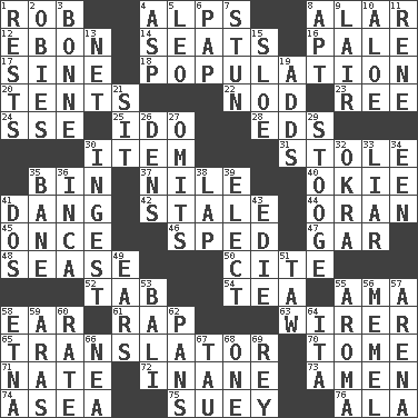 ACROSS 1. Director Reiner 4. High mountains 8. Having or resembling wings 12. Inky black, to poets 14. Theater features 16. Diluted with white 17. Trig term 18. Census information 20. Portable shelters 22. Lower and raise head in agreement 23. Portuguese money of account (variant) 24. Compass dir. 25. Wedding promise 28. Begley and Asner 30. A whole individual unit 31. Took without asking 35. Storage container 37. "Death on the ____" 40. Migrant worker of the '30s 41. Mild oath, euphamism for damn 42. Lacking originality or spontaneity 44. NW Algerian seaport 45. At one time in the past 46. Drove too fast 47. Slender fish 48. Gospel singer Marvin 50. Quote 52. Bar bill 54. Afternoon social gathering 55. Nanny (var.) 58. Hearing organ 61. Strike 63. One who wires 65. Interpreter 70. Heavy book 71. Nathan's nickname 72. Lacking in sense or substance 73. So be it 74. At sea 75. Chop _ 76. According to DOWN 1. Musical pauses 2. Off-Broadway awards 3. Child's nurse 4. Cleo's killer 5. Lion 6. Infant food 7. Astound 8. Fitting 9. Den 10. Medicinal plant 11. French philosopher Descartes 13. Remaining after all deductions 15. _ gin 19. Sums up 21. Be seated 26. Habitations of wild animals 27. Leaves out 29. Moe Howard, for one 30. Eat 32. Gumbo ingredient 33. One who doesn't tell the truth 34. Car or cant ending 35. Object of repulsion 36. South American Indian 38. Pet locale 39. Opt 41. Two (Sp.) 43. Singer Brickell 49. Hearing organs 51. The 23rd letter of the Hebrew alphabet 53. Indonesian resort city 55. Odor 56. Klaipeda city 57. Sports stadium 58. Inactive volcano in Sicily 59. Ancient river in northeast Turkey 60. Assign a rank or rating to 62. Zero-star reviews 64. Call ___ day 66. Teachers' org. 67. The 19th letter of the Greek alphabet 68. Single 69. Marina Del _, California