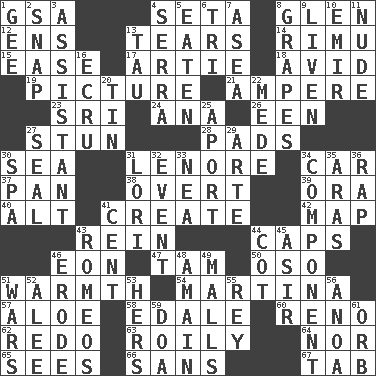 ACROSS 1. Girls' org. (abbr.) 4. Stalk of a moss capsule 8. Small, secluded valley 12. Followers of ems 13. Rends 14. Tall New Zealand timber tree 15. Comfort 17. Nick name for Arthur 18. Enthusiastic 19. Photo 21. Electrical Unit 23. _ Lanka 24. Santa ___, CA 26. Car or cant ending 27. Astound 28. Groovy apts. 30. Ocean 31. Poe poem 34. Auto 37. Baking dish 38. Unconcealed 39. Mouth or opening 40. Keyboard modifier key 41. Make 42. Atlas unit 43. It's straight from the horse's mouth 44. Smile enhancers 46. Age 47. Scottish cap 50. Bear (Spanish) 51. Heat 54. Chrissie's court nemesis 57. Medicinal plant 58. Peak District village in England 60. Former U.S. Attorney General Janet 62. Make new 63. Turbulent 64. And not 65. Perceives with the eye 66. Without 67. Keyboard key DOWN 1. Unit of force equal to gravity 2. Fastener 3. Aide 4. Spanish missionary in California 5. Eroded 6. Three (prefix) 7. Toward the sea 8. Wine fruits 9. Make or become more lively 10. Arab leader 11. Unadorned 13. The 19th letter of the Greek alphabet 16. Shade of tan 20. Metal container 22. Ancient Persian 25. To the left, to Queeg 27. Lick closed 29. Johnson of "Laugh-In" 30. Health resort 31. Australian parrot (variant) 32. Happening 33. Teachers' org. 34. Piece 35. Ancient river in northeast Turkey 36. Strike 41. Penny 43. Lover boys 44. Small bed 45. SW Saudi Arabia district 46. Eat (away) 48. At full speed 49. Promenades 51. Armed conflicts 52. Toward shelter 53. Possessive pronoun 55. Marina Del _, California 56. Small Philippine buffalo 59. ___ good deed 61. Globe