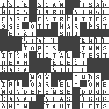 ACROSS 1. Capri or Wight 5. Skim 9. Russian ruler of old 13. Vintage cars 14. Edible starchy tuberous root 15. Burn superficially 16. Comfort 17. Pleas 19. Compass dir. 20. Baseball player Mel 21. Impair 22. Pacific Standard Time (abbr.) 23. Part of Q.E.F. 25. _ Lanka 26. Showing deterioration from age 30. Leg joint 34. Drinks excessively 35. Restaurants 36. Hankering 39. Add up to 42. Trial 43. 480, 500 or 516 sheets of paper 44. Voters do this 46. "Two Mules for Sister ____" 47. Vertical member of a panel or frame 48. At this time 51. Extremities 54. Retirement account (abbr.) 57. Rowing implement 58. Shade tree 60. Single 62. Unrelated to defense, as in spending 65. Scent 66. Lessep's creation 67. Oceans 68. Russian composer Stravinsky 69. So be it 70. Strained 71. Allows DOWN 1. Angers 2. Gospel singer Marvin 3. Failure 4. Compass dir. 5. Proofreading order 6. Patter 7. Nonscientific branch of learning 8. Typical models 9. Teat (slang) 10. Clip 11. Matures 12. Respite 15. Indian skirt 18. Hearing organ 20. "Beetle Bailey" pooch 24. Respiratory problem 27. Fitting 28. Lion 29. _____ Park, CO 30. Baby cat 31. Compass dir. 32. Followers of ems 33. Eastern Standard Time (abbr.) 36. Big collection agency 37. Beverage made from leaves 38. 4-wheeled motor vehicle 40. Keyboard modifier key 41. Luau accessory 45. Clement's nick name 48. Christmas carol 49. Clumsy lout 50. Obtain by seizing forcibly or violently 52. Evade 53. Snout, nose 54. South American Indian 55. Wander 56. Queen of England 1702-14 58. He sold his birthright 59. For fear that 61. Blunders 63. Daniel's nick name 64. Teachers' org. 65. Petroleum