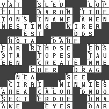 ACROSS 1. Large container 4. Downhill vehicle 8. Trim (branches) 11. Biblical high priest 12. Composer Copland 14. Periodic rise and fall of the sea level 15. Charged particles 17. Silly 18. So be it 19. Nestling 21. One who wires 23. Eastern Standard Time (abbr.) 24. Two (Sp.) 25. Roll call or roster of names 27. Have the gumption 30. Ewer handle 31. Full of chinks, cracks, or crevices 34. Begley and Asner 37. R.R. building 38. Drinks excessively 39. The 19th letter of the Greek alphabet 40. Car or cant ending 41. Make 43. Compass dir. 44. "Mermaids" star 45. To draw with force 47. Teachers' org. 49. Observe 50. High-altitude cloud 52. Fools 56. Length times width 57. Bodily heat indicating an inflammation 60. Southwest Nigerian state 61. Religious group 62. Wear away 63. Heredity factor (abbr.) 64. Deep reverence 65. Snake ____ (dice throw) 66. Boat paddle DOWN 1. Distinctive style or manner 2. _ vera 3. Metal containers 4. Inhabitant of Heaven 5. Long (Scottish) 6. Epoch 7. Spanish title 8. Citrus fruits 9. River in Europe 10. Fenced enclosure 13. ___ Haven, CT 14. Edible starchy tuberous root 16. Proofreading order 20. Austrian river, tributary to the Danube 22. Binary compound 25. Pace 26. Northwest Algerian city 27. Drug addict 28. At sea 29. Take ten 30. Compass dir. 32. Hankering 33. Greater amount 34. Inactive volcano in Sicily 35. Mild oath, euphamism for damn 36. Institute legal proceedings 42. Genesis locale 44. Automobile 46. Western Nevada city 47. Sibling's daughter 48. Part of Q.E.F. 49. Begets 50. Ship's personnel 51. Frozen water 52. Connecting point 53. Southeast Asian peninsula 54. Pulitzer Prize-winning author Ferber 55. Fly high 56. White ___ sheet 58. "We ___ not amused" (Victoria) 59. Myrna of the movies