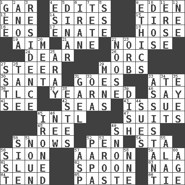 ACROSS 1. Slender fish 4. Prepares for publication 9. Genesis locale 13. Compass dir. 14. Begets 15. Become fatigued 16. Greek goddess of the dawn 17. Maternal 18. Flexible conduit 19. Direct toward a target or goal 21. One (Scot) 22. Annoying sound 24. Letter starter 26. The grampus (Milton) 27. Guide 29. Disorderly crowds 30. Before Barbara or Clara 31. Moves 33. Had dinner 36. Affectionate concern, for short 37. Felt deep pity or tenderness 40. Declare 41. Observe 42. Oceans 43. Come out of 45. International (abbr.) 47. Sets or collections 48. To separate or throw off 49. "______ My Girl" (Turtles hit) 50. Overwhelms 52. Animal enclosure 54. R.R. building 56. The Jewish people; Israel 57. Composer Copland 59. Wing 61. Change direction abruptly 62. Soup utensil 63. Tired old horse 64. Look after 65. Thick mixture 66. Neckwear DOWN 1. Turn to the right 2. Small Philippine buffalo 3. Home 4. Compass dir. 5. Middle Eastern gold or silver currency 6. SW Asia republic 7. False hair 8. Compass dir. 9. Principles of right and wrong 10. "Vaya con ____" 11. Celtic language 12. Born 20. Confront 22. Trap for birds or small mammals 23. Globe 25. Like ___ of sunshine 27. Fast planes 28. Story 29. Not women's 31. Highlander 32. Mouth or opening 33. Aide 34. Strained 35. Snake ____ (dice throw) 38. _____ Park, CO 39. Food container 44. Takes to court 45. Pressed 46. ___ Haven, CT 49. Snob 50. Drop; flow; fall 51. Part of speech 52. Dad 53. Greek god of love 55. Jai _ 56. Fast jet (abbr.) 57. Cleo's killer 58. Compass dir. 60. Personal question