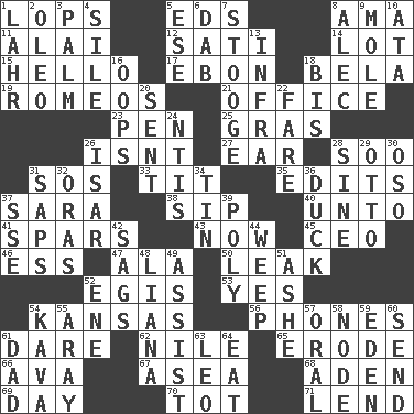 ACROSS 1. Chops off 5. Begley and Asner 8. Housemaid (var.) 11. Mountain range southwest of Kyrgyzstan 12. Suttee (variant) 14. Car dealer's back yard 15. Phone greeting 17. Inky black, to poets 18. Actor Lugosi 19. Lover boys 21. Position of authority 23. Writing instrument 25. Pate de foie ____ 26. Is not 27. Hearing organ 28. "Barney Miller" actor Jack 31. Distress signal 33. Teat (slang) 35. Prepares for publication 37. "Two Mules for Sister ____" 38. Small drink 40. To (old English) 41. Practice fights 43. At this time 45. Corporate head (abbr.) 46. Curvy letter 47. In the manner of 50. Path through which fluid escapes 52. Armor plate that protects the chest 53. Consenting reply 54. Sunflower state 56. Gives a jingle 61. Have the gumption 62. The longest river in the world 65. Wear away 66. Actress Gardner 67. At sea 68. An important port of Yemen 69. 24 hours 70. Small child 71. Grant temporary use of DOWN 1. Cowardly lion portrayer 2. Margarine 3. Inside of hand 4. Filth; sediment 5. Compass dir. 6. Apply (a substance) by light strokes 7. Moe Howard, for one 8. Actor Baldwin 9. Undercover agent 10. "One Day ___ Time" 13. Kind of red light 16. I made a mistake 18. Altar cloth linen 20. Transmitted 22. Conductor's collection 24. Nuclear Threat Initiatives 26. Austrian river, tributary to the Danube 28. Trig term 29. Von Bismarck 30. Bear (Spanish) 31. Plant excrements 32. Mouths or openings 34. Shallow baking pan 36. Evade 37. Compass dir. 39. Much (prefix) 42. Sinks 44. Shed a tear 48. Woody, climbing, usually tropical plant 49. Aid 51. American tennis player Robert 52. Compass dir. 54. Polynesian shrub of the pepper family 55. Like ___ of sunshine 57. Spoken 58. Connecting point 59. Paradise 60. Transmit 61. Male parent 63. Lion 64. Ingest