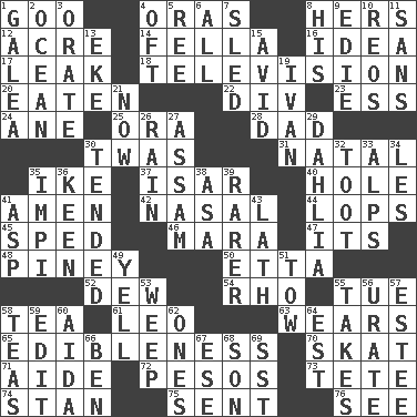 ACROSS 1. Thick or sticky substance 4. Mouths or openings 8. Possessive pronoun 12. Measure of real estate 14. Man or boy (slang) 16. The main thing one is thinking about 17. Path through which fluid escapes 18. Household entertainment appliance 20. Eroded 22. HTML Container Element 23. Double-curved letter 24. A saturated hydrocarbon 25. Mouth or opening 28. June honoree 30. It was, poetically 31. Relating to or accompanying birth 35. Eisenhower's nickname 37. Austrian river, tributary to the Danube 40. Opening into or through something 41. So be it 42. Relating to the nose 44. Chops off 45. Moved rapidly 46. Hindu Mythology: god of death 47. It is 48. Abounding in pines 50. Singer James 52. Morning condensation 54. 17th letter of the Greek alphabet 55. Third day of the wk. 58. Beverage made from leaves 61. Lion 63. Puts on (as clothing) 65. The property of being fit to eat 70. Three-handed card game 71. Helper 72. Mexican monetary units 73. False hair 74. Comedian Laurel of Laurel & Hardy 75. Posted 76. Observe DOWN 1. An organ shaped like a helmet 2. Sea 3. Declaim 4. Often (poetically) 5. To separate or throw off 6. Everything 7. Downhill vehicle 8. Part of HMS, perhaps 9. Singer Brickell 10. Vintage cars 11. Without 13. Make supply last 15. Enthusiastic 19. "Terrible" tsar 21. Immediately 26. Precipitation 27. Indian state 29. A pale violet or amethyst color 30. Looked after 32. A blast of a horn 33. High mountains 34. French article 35. Body of Kaffir warriors 36. Peachy ____! 38. White ___ sheet 39. More valued for its uncommonness 41. Viper 43. Thin strip of wood or metal 49. Shout 51. Pull behind 53. Shed a tear 55. Proceeds 56. A salt of uric acid 57. First name in cosmetics 58. Afternoon social gatherings 59. Prepare for publication 60. Opera by Verdi 62. Washington bills 64. Eastern Standard Time (abbr.) 66. Benjamin's nick name 67. Compass dir. 68. Male child 69. Fast jet (abbr.)