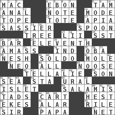 ACROSS 1. Big _ 4. Inky black, to poets 8. Scottish cap 11. Of or related to the anus 13. Observe 14. Method 15. Drink excessively 16. Carryall 17. Capital of Western Samoa 18. More impudent 21. Soup utensil 22. Relationship diagram 23. Cards in a Roman deck? 25. Fast jet (abbr.) 26. Oblong piece of solid material 29. Veterans Day date 32. Collect or gather 34. Indiana (abbr.) 35. Chief or king in Benin or Nigeria 38. Soft 39. Twentieth part of a lira 41. Undercover agent 43. Modern: prefix 44. Everything 45. Trap for birds or small mammals 46. Copy Pinocchio 50. Male child 51. Ocean 54. R.R. building 55. Mountain range 57. Small island 59. Deli grouping 63. Small amounts or degrees 64. Heavy open wagon 67. Behest 68. Makes supply last 69. Having or resembling wings 70. Cause heat under the collar 71. Title for a knight 72. Dad 73. Fish or hair follower DOWN 1. Floor protectors 2. Small Philippine buffalo 3. Balmoral and tarboosh 4. Main course 5. Oct. 31 cry 6. Baseball player Mel 7. Born 8. Traditional theme or motif 9. Goodbye (Sp.) 10. Intended 12. For fear that 14. Atlas unit 19. Angers 20. Snakelike fish 21. Be seated 23. Grant temporary use of 24. _ china 26. Forbid 27. So be it 28. Raze (variant) 30. Country residence 31. Same (prefix) 33. Guess 36. Scornful sounds 37. In addition 39. Table seasoning 40. Rounded earthenware pot or jar 42. Car or cant ending 45. Anneal 47. Eastern Standard Time (abbr.) 48. A period of five years 49. Retirement account (abbr.) 51. Locates 52. 1973 Nobel Price Winner (Physics) Leo 53. Tree or shrub in the Birch family 56. Cowardly lion portrayer 58. Double-curved letter 60. Count _ (2 wds.) 61. Small island 62. Proofreading order 64. Head covering 65. In the manner of 66. Hit sharply and swiftly