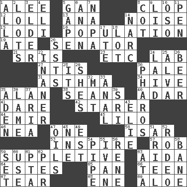 ACROSS 1. Toward shelter 5. Separate the seeds from cotton 8. Hoof sound 12. Hang loosely or laxly 13. Santa ___, CA 14. Annoying sound 15. Farming town in central California 16. Census information 19. Had dinner 20. Legislator 21. Indian titles of respect 23. And so on (abbr.) 24. Experiment locale 27. Nuclear Threat Initiatives 30. Light colored 31. Respiratory problem 34. Hub of activity 35. Actor Alda or Thicke 38. Seines 40. The sixth month of the Jewish calendar 41. Have the gumption 42. A viewer who gazes fixedly 44. Arab leader 45. _ and Stitch 46. Teachers' org. 47. Single 50. Austrian river, tributary to the Danube 53. Motivate 57. Director Reiner 59. Supplying deficiencies 63. Opera by Verdi 64. _____ Park, CO 65. Baking dish 66. Adolescent 67. Lacerate 68. Compass dir. 69. _ vera DOWN 1. Silent film actress Nazimova 2. Plunders 3. A person who is older than you are 4. Biblical high priest 5. Yawn 6. Soon (poet.) 7. California wine valley 8. Small bed 9. Cards in a Roman deck? 10. Bear (Spanish) 11. Writing instrument 14. Drug cop 17. Shoshoni 18. Car dealer's back yard 20. Fast planes 22. More empty; more void 24. Put down 25. Inventor's middle name 26. Fermented drink made from hops 28. It is 29. "______ My Girl" (Turtles hit) 30. N Egypt peninsula 32. Floor protector 33. Of or related to the anus 35. An important port of Yemen 36. Unable to walk 37. Operatic vocal solo 39. _ Lanka 43. Writer Wiesel 47. Petroleums 48. Compass dir. 49. Eastern Standard Time (abbr.) 51. Satellite of Uranus 52. Cowboy competition 54. Corncob 55. "Terrible" tsar 56. French philosopher Descartes 58. Object of repulsion 59. Arrange properly for use 60. Purpose 61. Parent Teacher Association (abbr.) 62. For each 63. "One Day ___ Time"