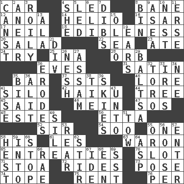 ACROSS 1. 4-wheeled motor vehicle 4. Downhill vehicle 8. Object of repulsion 12. Small Philippine buffalo 14. Sun: prefix 16. Austrian river, tributary to the Danube 17. Famous astronaut Armstrong 18. The property of being fit to eat 20. Vegetable dish 22. Ocean 23. Had dinner 24. Attempt 25. _ tizzy (2 wds.) 28. Globe 30. Nights before holidays 31. Smooth fabric 35. Drinking establishment 37. Fast planes 40. Old wives' tales, e.g. 41. Grain storage tower 42. Japanese poetic form 44. Woody plant 45. Alleged 46. Chow _ 47. Mayday 48. _____ Park, CO 50. Singer James 52. Title for a knight 54. "Barney Miller" actor Jack 55. Single 58. Part of HMS, perhaps 61. French article 63. Make _____ (do battle with) 65. Pleas 70. Notch 71. Portico 72. Amusement-park features 73. Introduce or present, as a question 74. Drink excessively 75. Monthly bill 76. For each DOWN 1. 2nd pers. sing. pres. of can (arch.) 2. Approach 3. Turbulent 4. A female animal or person 5. Directed 6. Connecticut Ivy Leaguer 7. Claim 8. Storage container 9. At sea 10. Political cartoonist Thomas 11. Celtic language 13. Wing 15. Margarine 19. Hearing organs 21. HTML Container Element 26. Tender 27. Indian state 29. Greek mezzo-soprano Agnes 30. Eats (away) 32. "Corrida" creature 33. Angers 34. Born 35. Prejudice 36. Set down 38. Make a knot 39. Atmospheres 41. Compass dir. 43. To (old English) 49. Drop; flow; fall 51. Pull behind 53. Stern 55. Lowest deck of a ship 56. Trap for birds or small mammals 57. Keyboard key 58. Command 59. To the inside or interior of 60. Constrict 62. Agitate 64. Viper 66. Actress Charlotte 67. Binary compound 68. Car or cant ending 69. Fast jet (abbr.)