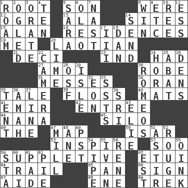 ACROSS 1. Carrot, for example 5. Male offspring 8. Past tense of be (plural) 12. Legendary monster 13. Chicken ___ king 14. Settings 15. ____ Jay Lerner 16. Homes 19. Was introduced to 20. Of or relating to Laos or its people 21. Tenth: prefix 23. Working for oneself (abbr.) 24. Possessed 27. Mine, in Marseilles 30. Loose flowing garment 31. Makes clutter 34. NW Algerian seaport 35. Story 38. Soft thread for cleaning between teeth 40. Floor protectors 41. Independent ruler or chieftain 42. Main course 44. Grandmother 45. Grain storage tower 46. Definite Article 47. Atlas unit 50. Austrian river, tributary to the Danube 53. Stimulate to action 57. "Barney Miller" actor Jack 59. Supplementary 63. Needle holder 64. Lag or linger behind 65. Baking dish 66. Attach a signature 67. Assistant 68. Compass dir. 69. Long journey DOWN 1. Wander 2. Stared at amorously 3. Declaim 4. "___ Little Indians" 5. "Two Mules for Sister ____" 6. Margarine 7. Political cartoonist Thomas 8. Victory 9. And so on (abbr.) 10. To riddle 11. Curvy letter 14. Post 17. One more than two 18. Daniel's nick name 20. Citrus frut 22. Device for capturing images 24. Israeli folk dance 25. Blind as ____ 26. Habitations of wild animals 28. Order of Saint Francis (abbr.) 29. Small island 30. Lover boys 32. A really long time 33. Fast planes 35. Portable shelter 36. Nanny 37. Actor's bit 39. Indian title of respect (Mr.) 43. Writer Wiesel 47. Place where flour is made 48. A saturated hydrocarbon 49. Pacific Standard Time (abbr.) 51. Having gotten out of bed 52. Makeup applied to the cheeks 54. Corncob 55. "Terrible" tsar 56. French philosopher Descartes 58. Pig sound 59. R.R. building 60. RI univ. 61. Groovy apt. 62. Sliced dessert 63. Eastern Standard Time (abbr.)